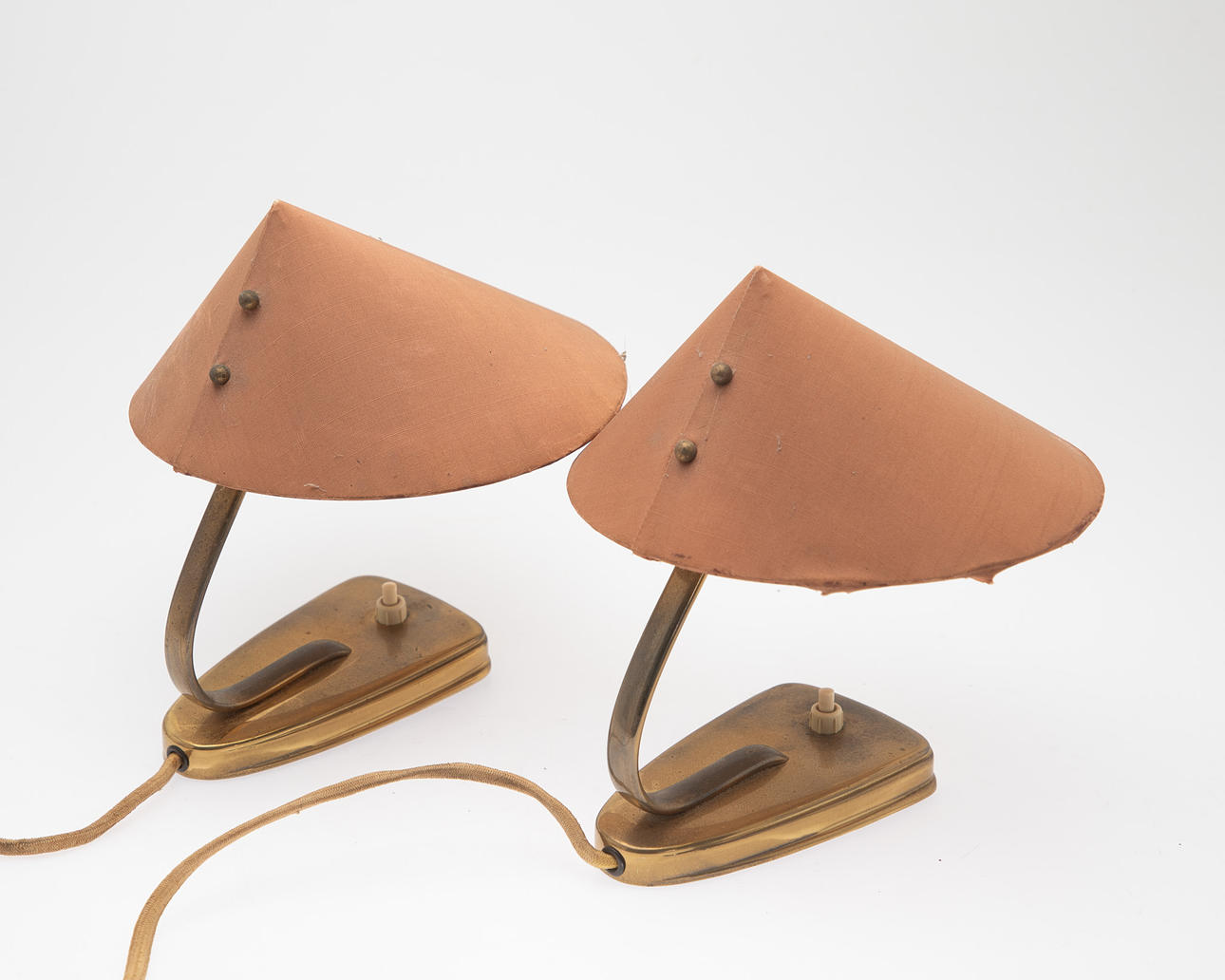 Brass. Fabric lampshades. H. approx. 22 cm, Diam. approx. 18 cm.