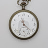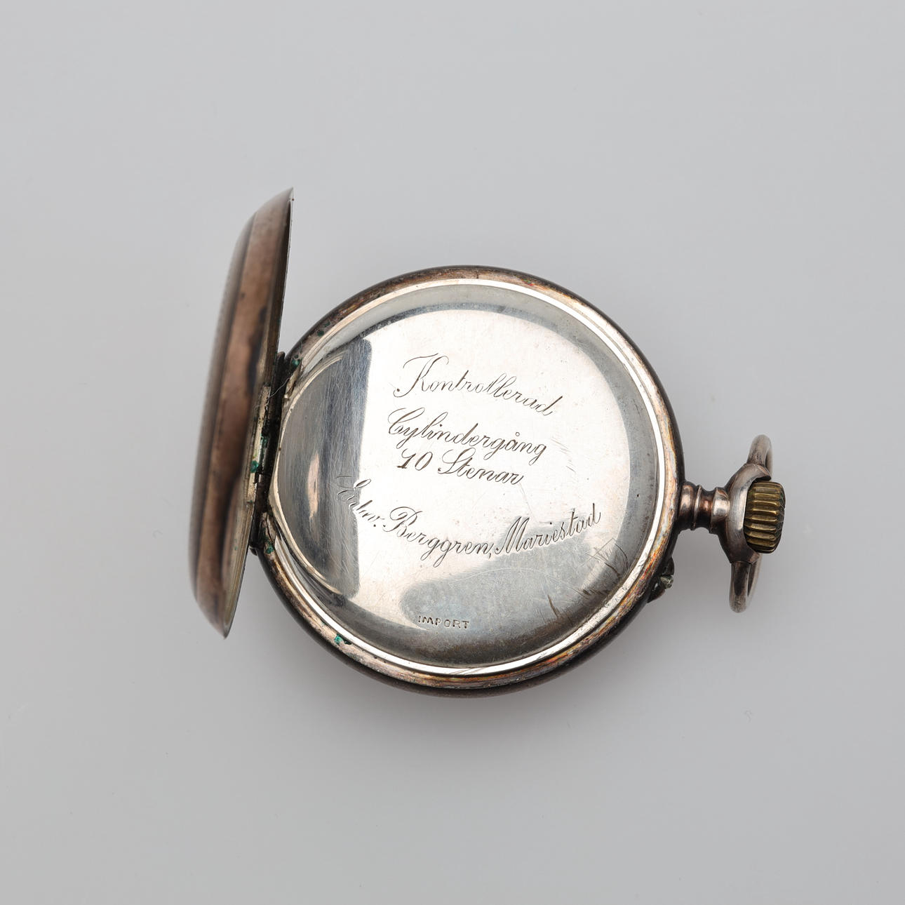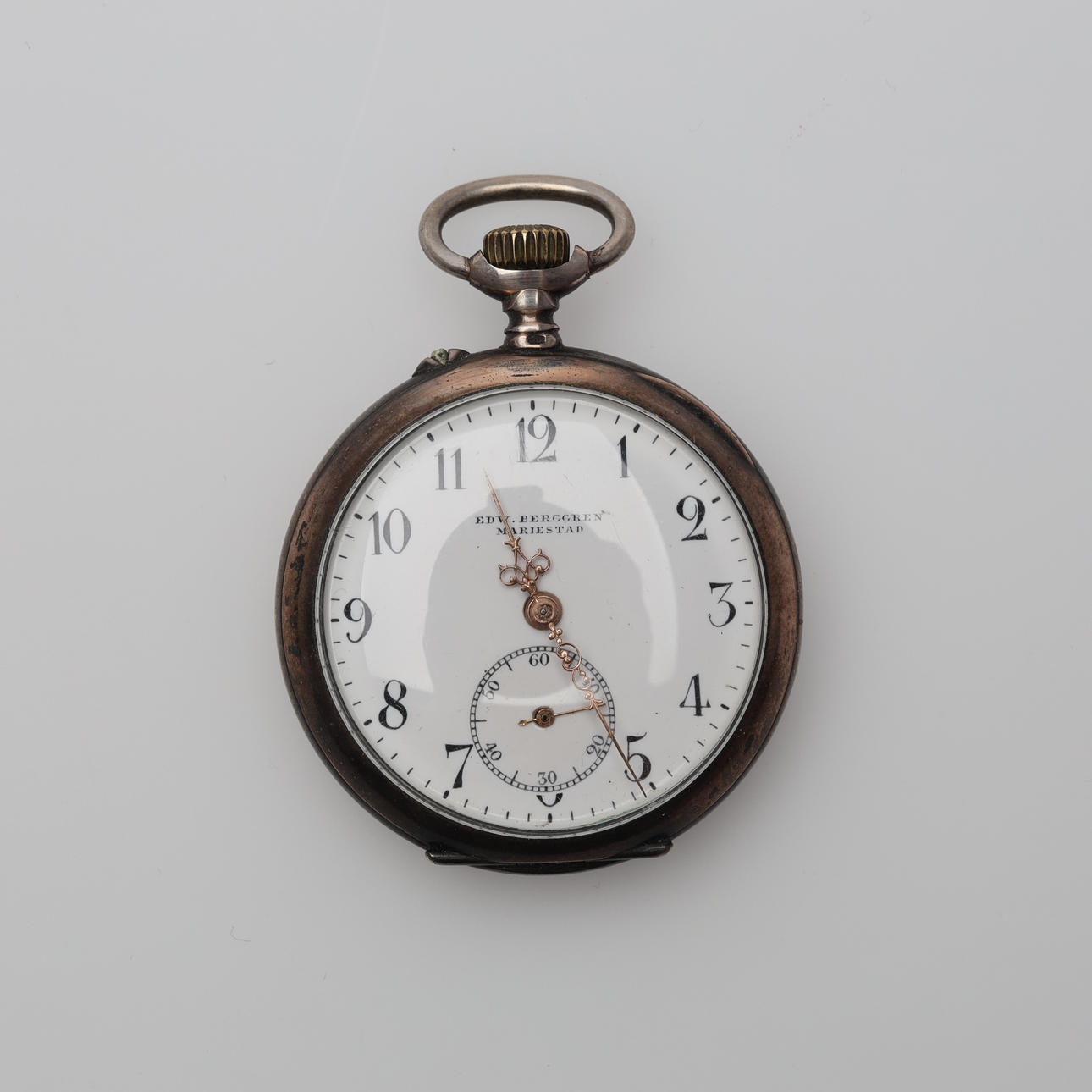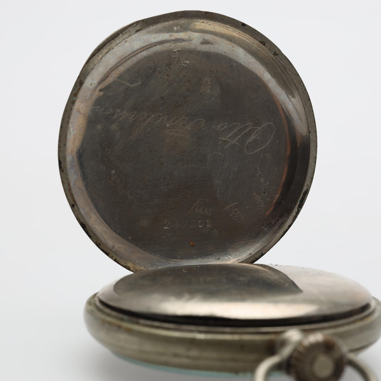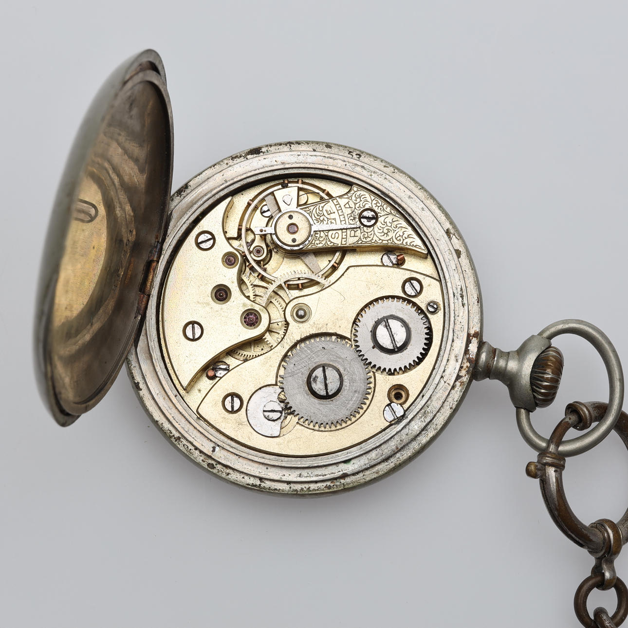Wear from use, silver pocket watch functional at time of cataloging, metal pocket watch defective, requires service.