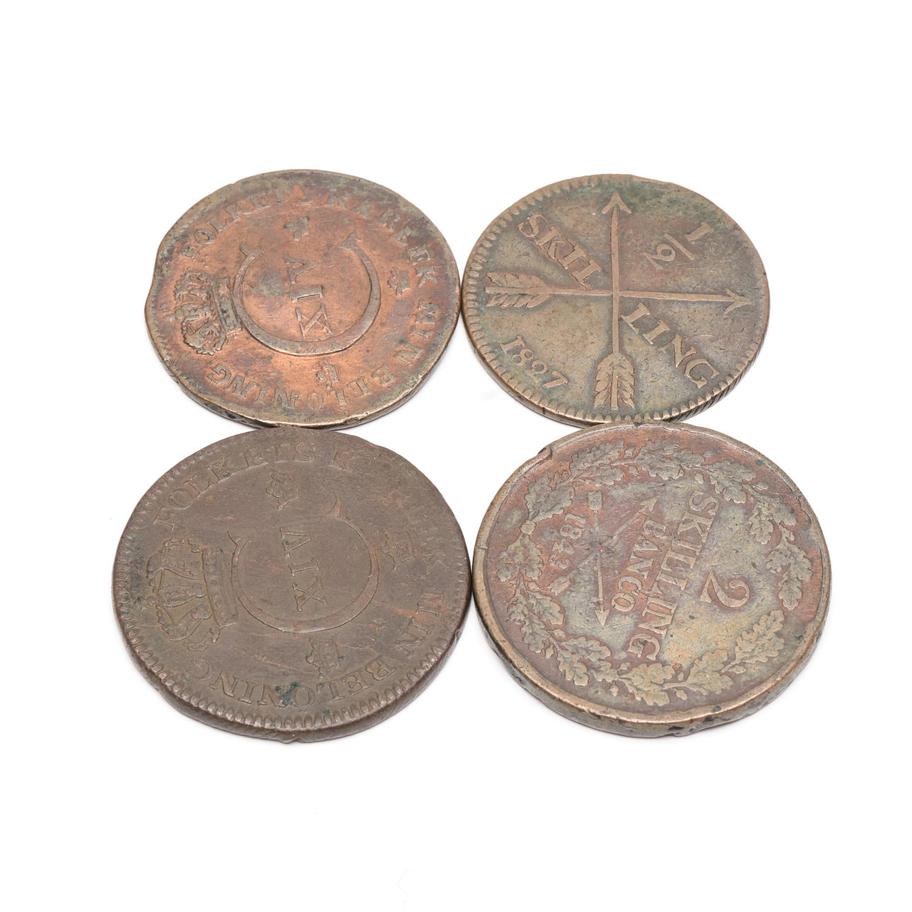 4 coins, 1-2 Skilling, 1822, 1843, 1827, 1828. Total weight approximately 50.3 grams.