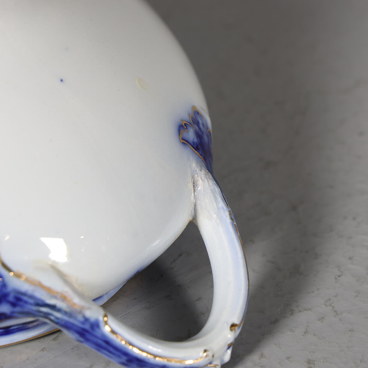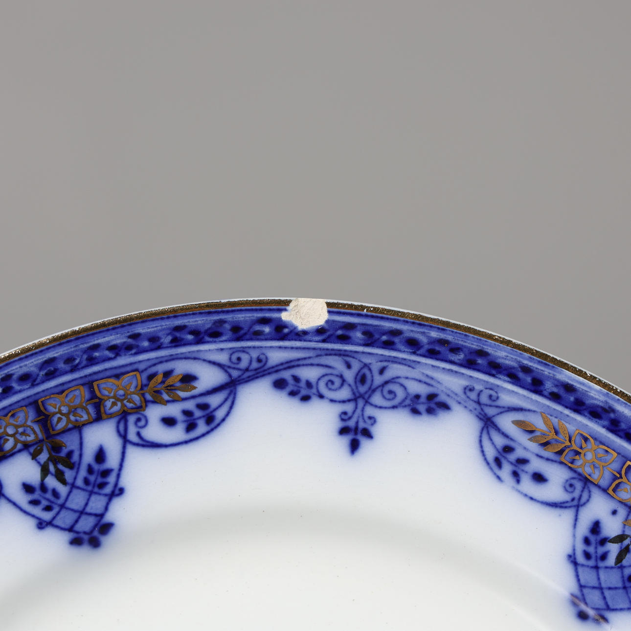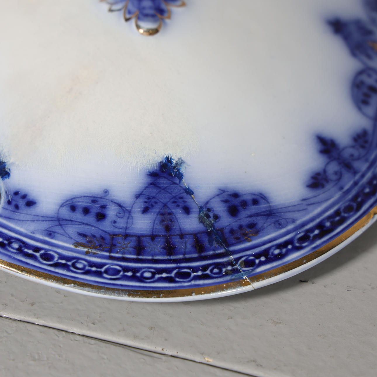 Wear from use, crazing, partially yellowed earthenware. Repair, chips and cracks on 18 pieces.