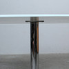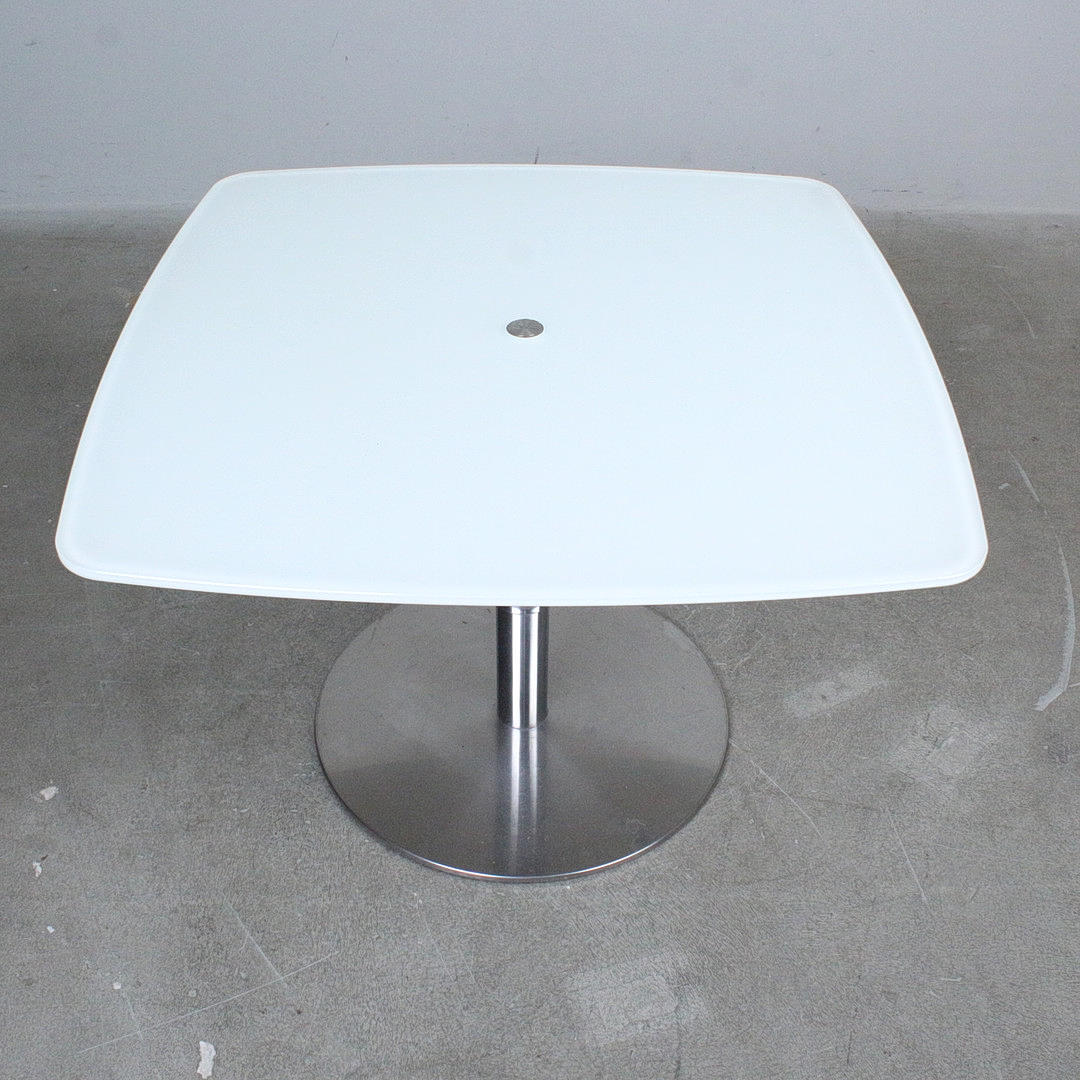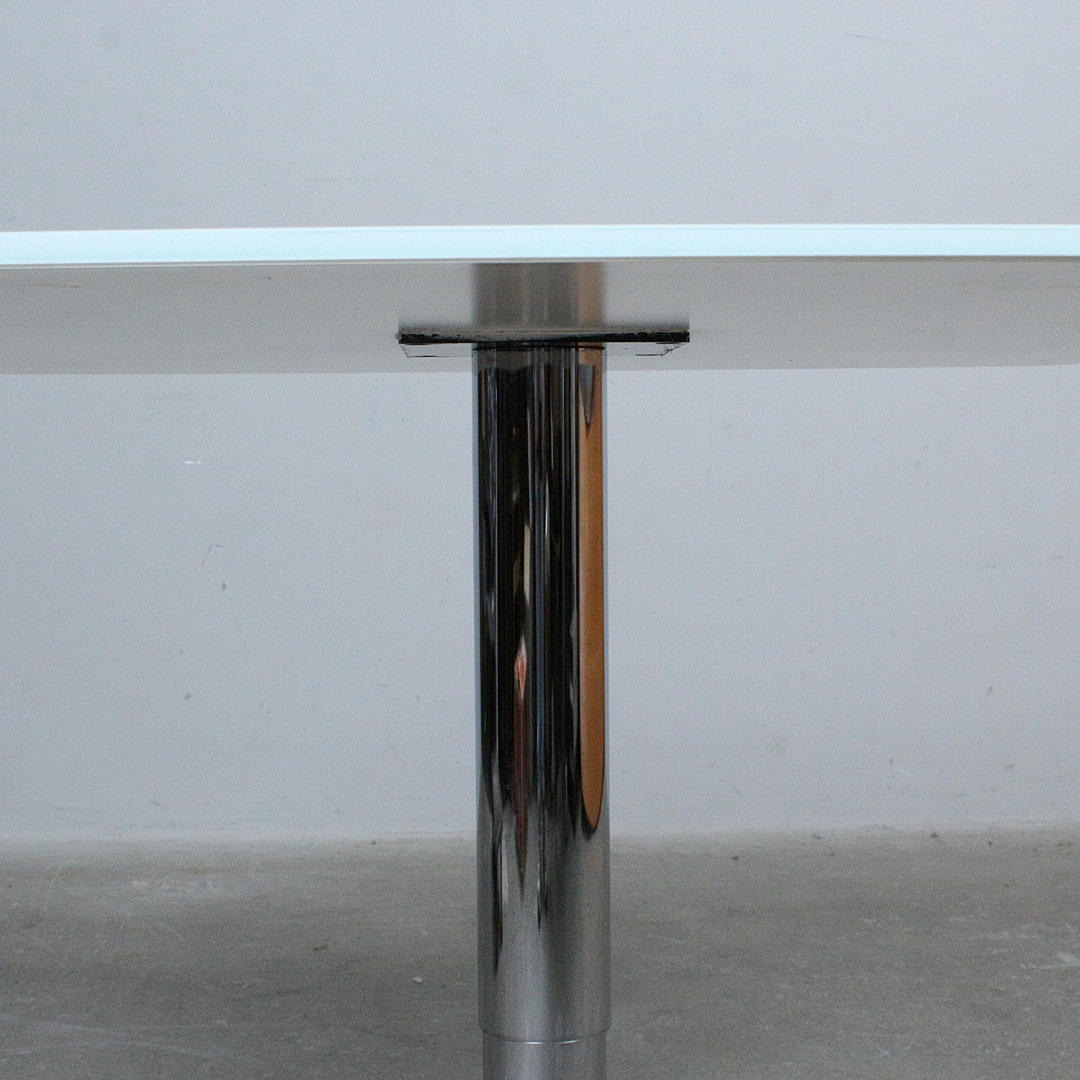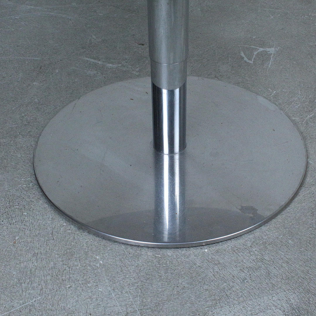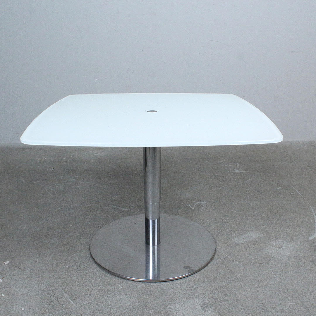 Ronald Schmitt, height-adjustable table, 'Triplex' series. Crafted from chrome and frosted glass. Press and hold the central button to adjust.
