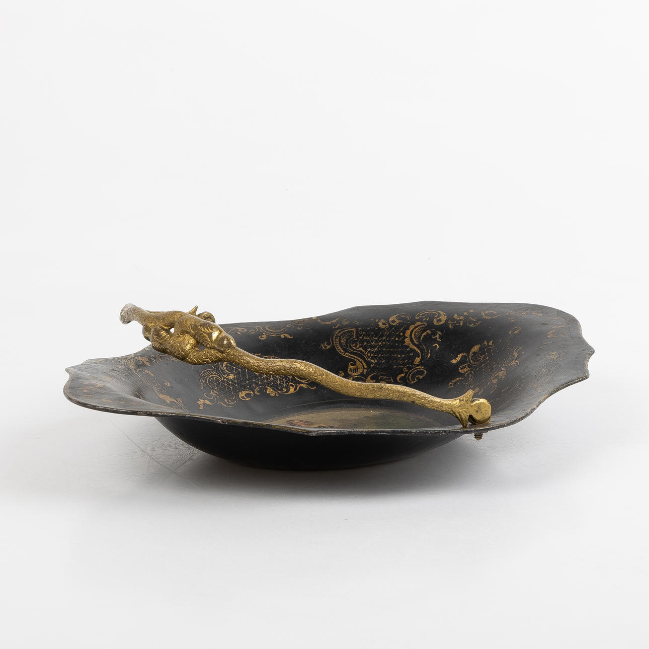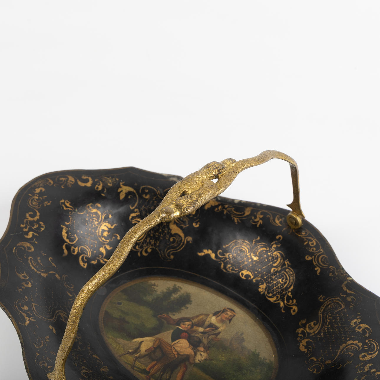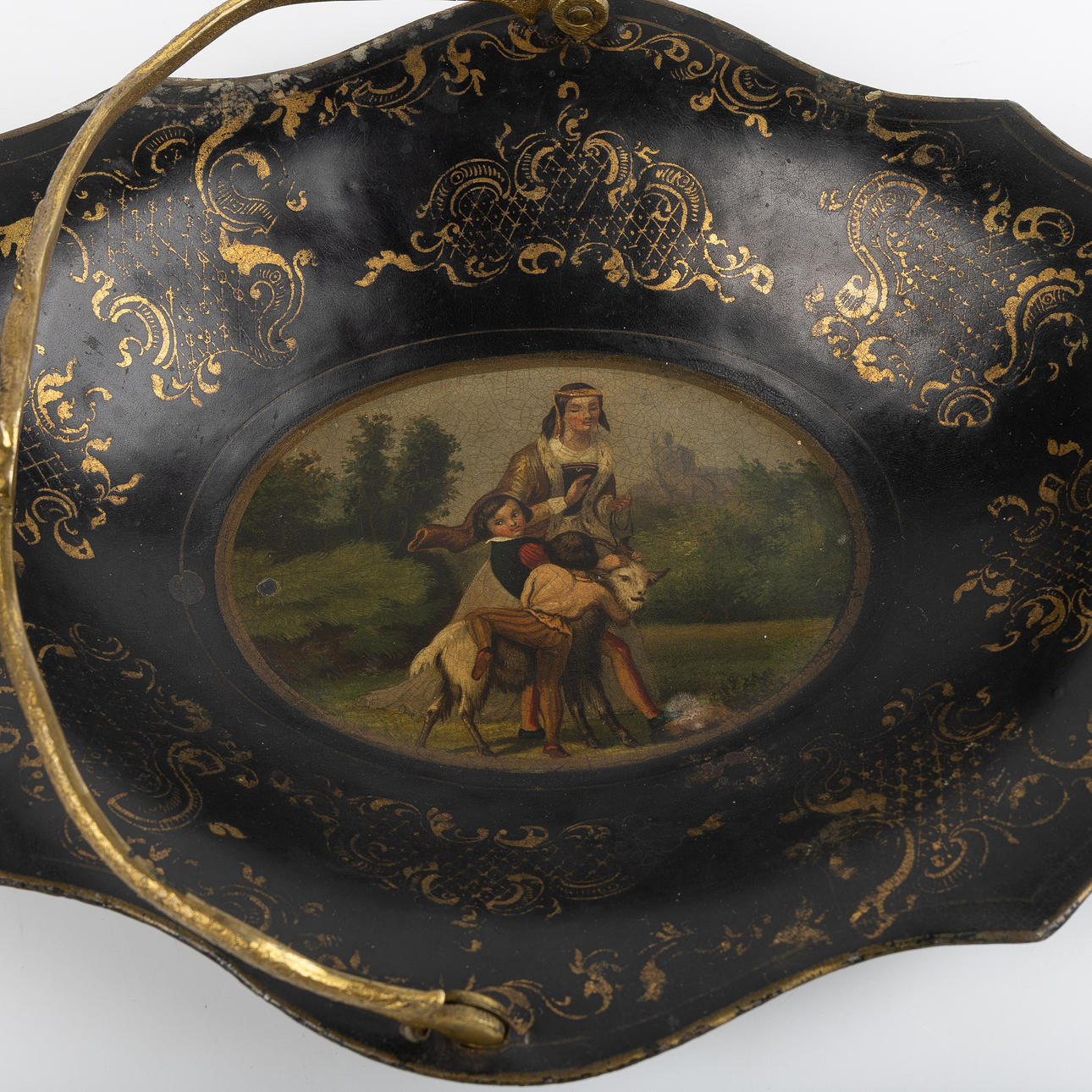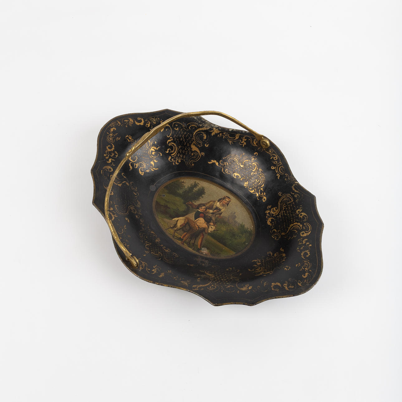 Handles in the shape of swan necks with the heads biting themselves. Painted decoration with a boy riding a goat. L approx. 30.5 cm.