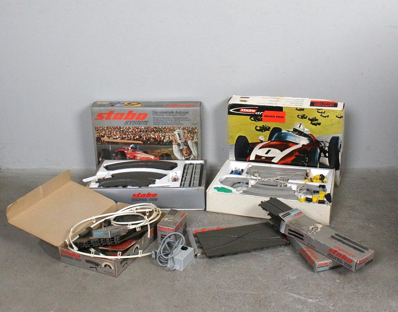 Set Stabo race track with various accessories. Dimensions of largest box: W 62, H 11, D 45.