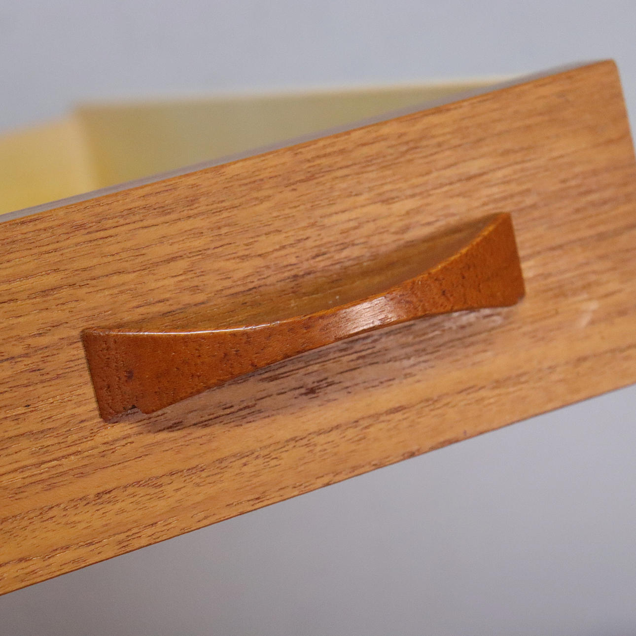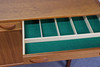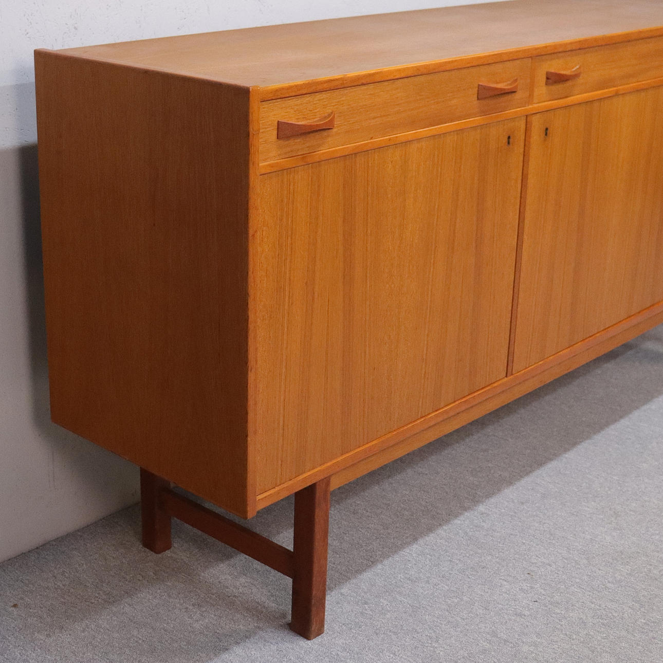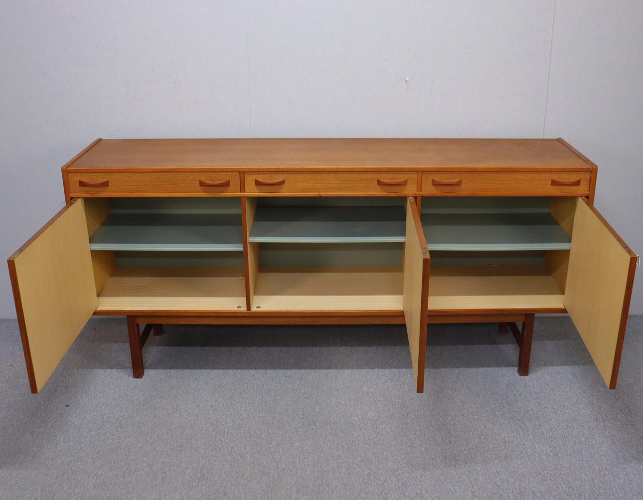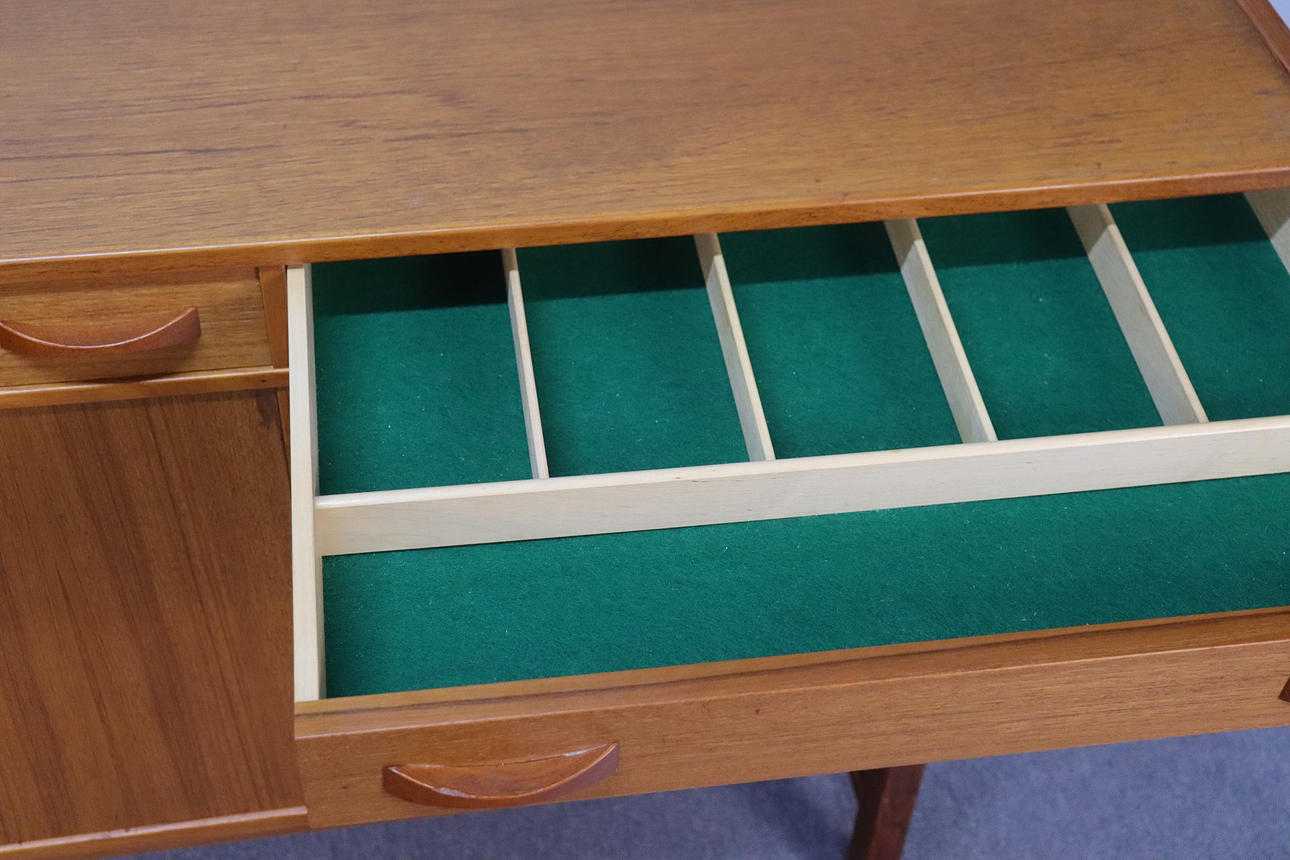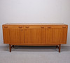 Teak veneer. Three drawers. Three doors with shelves behind. 183x43 cm, height 84 cm.