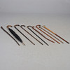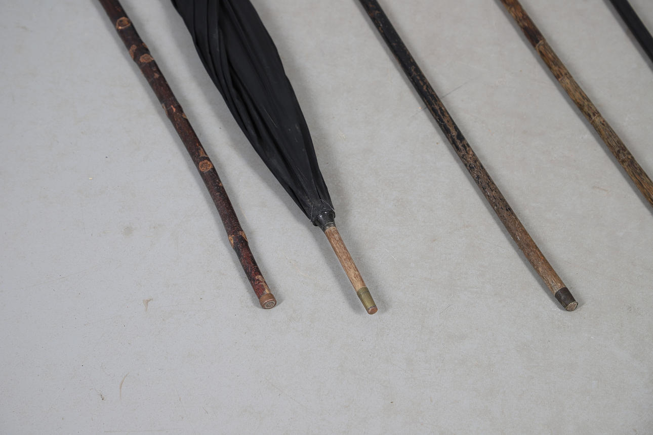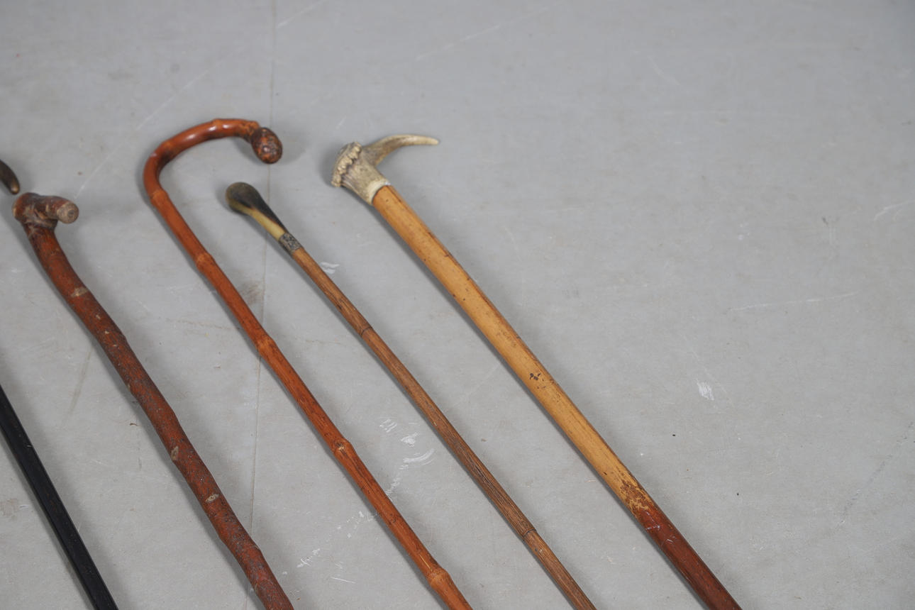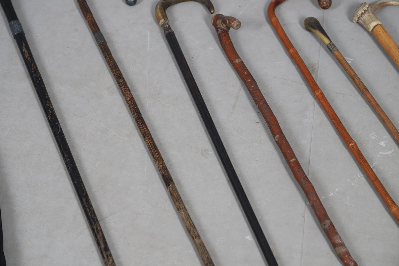 A variety of walking sticks including some with silver mounts, also with an umbrella with silver mount to the tip (90cms long), Largest 92cms long.