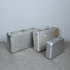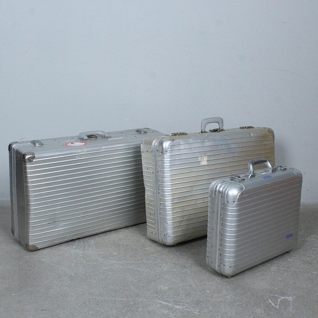 Three aluminium suitcases, including Rimowa.