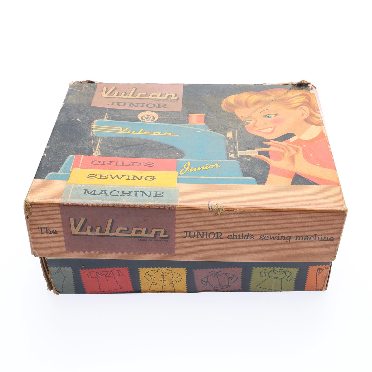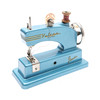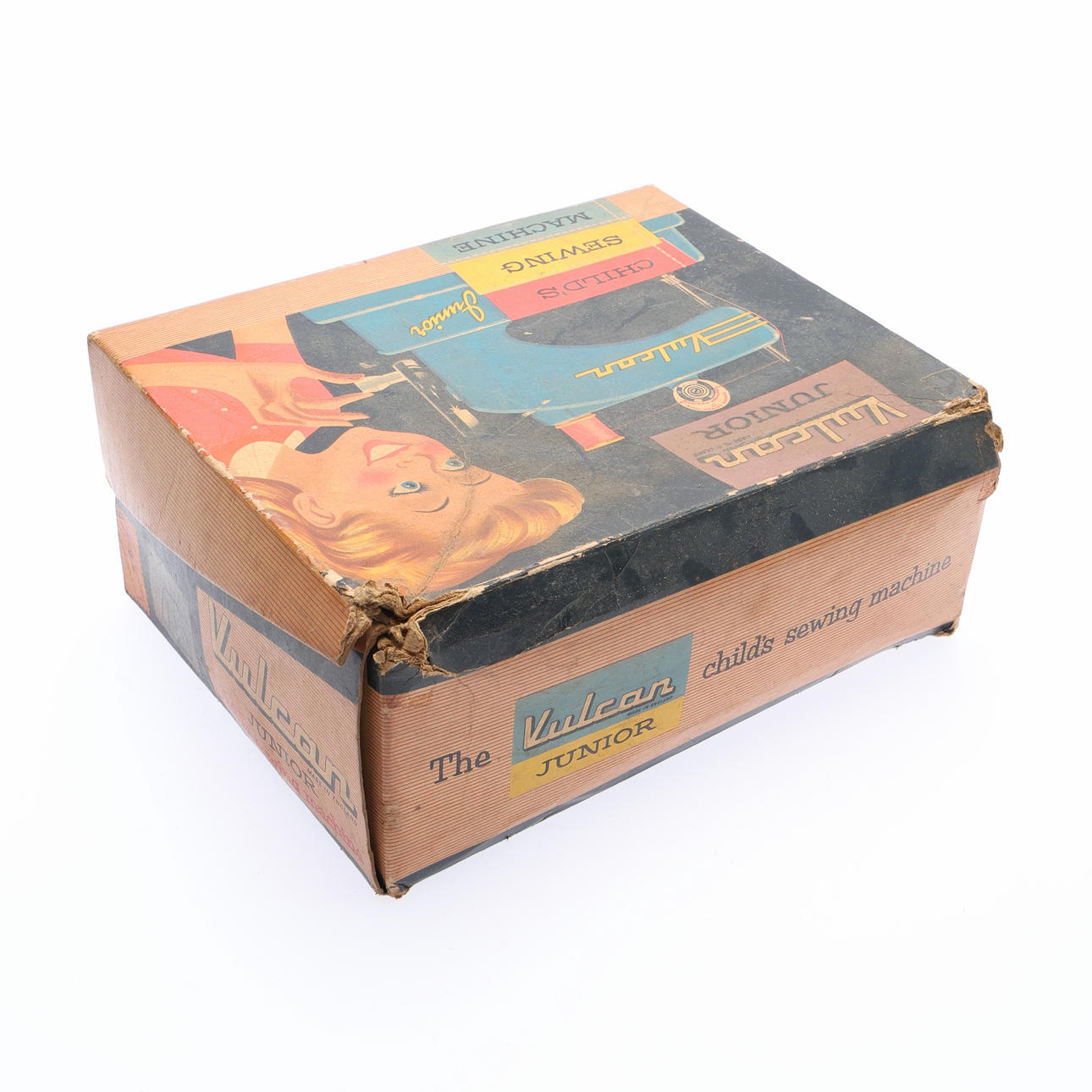 painted cast metal, with an all over blue colour and yellow lettering 'Vulcan Junior', with manual turn wheel to side, in original vulcan junior box, H.8.5cm x W.21cm x D.16.5cm the box.