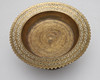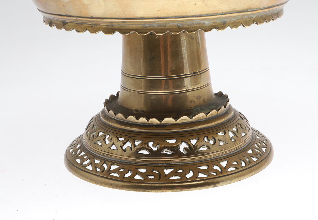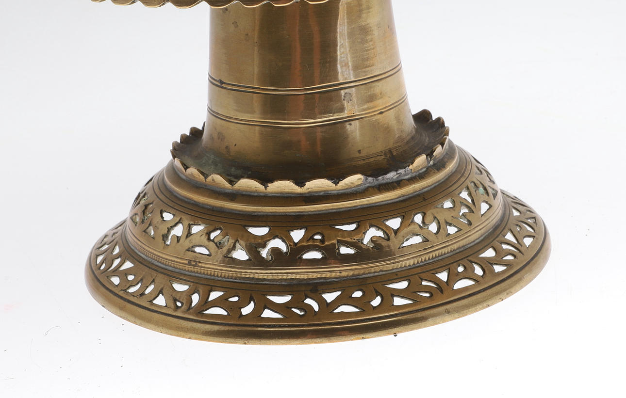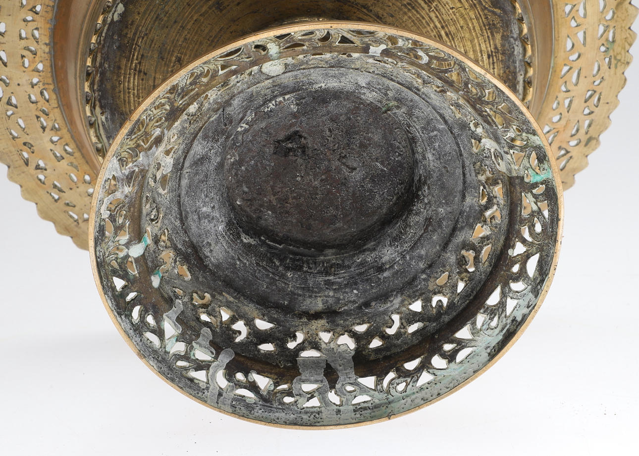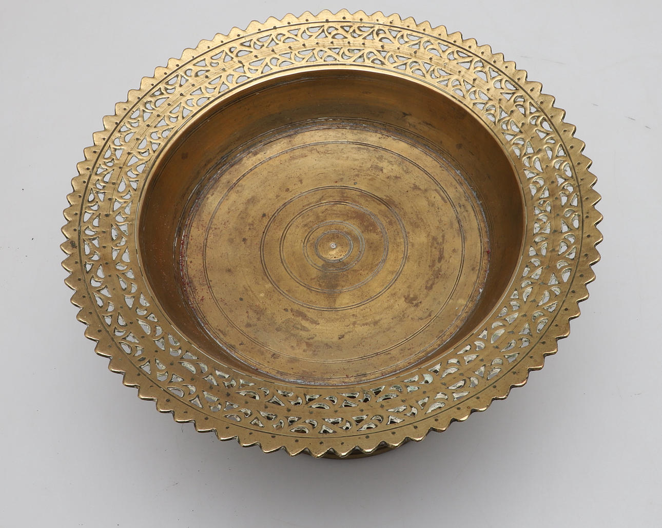 A brass tazza with a pierced rim and circular base, 15.5cms high, 27.5cms diameter.