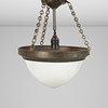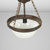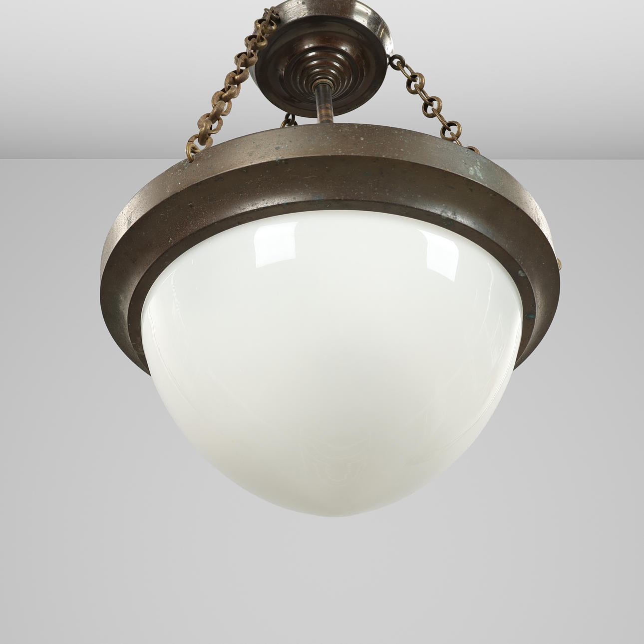 Art Nouveau ceiling lamp with a white opal glass shade, one socket, and fittings and chain suspension in patinated metal, approx. 1920.