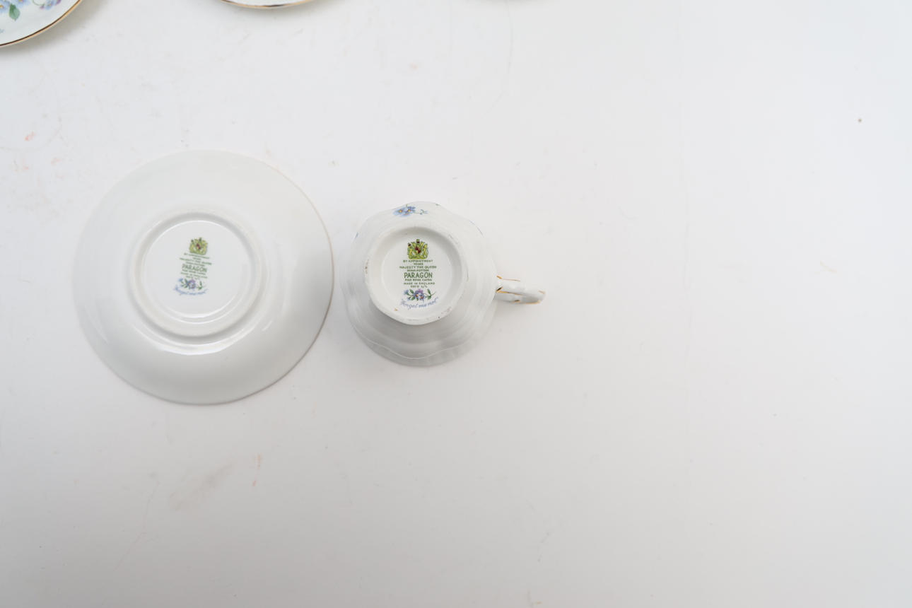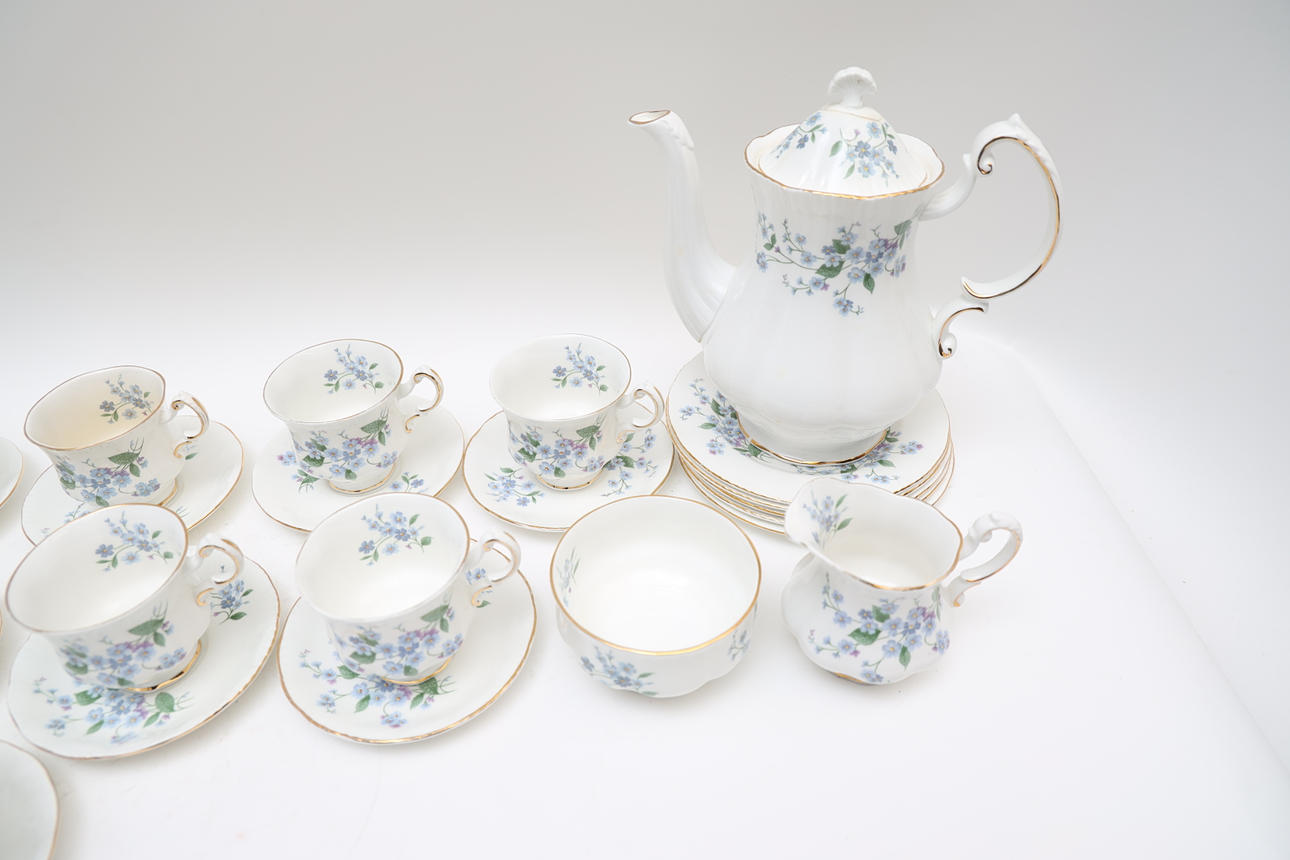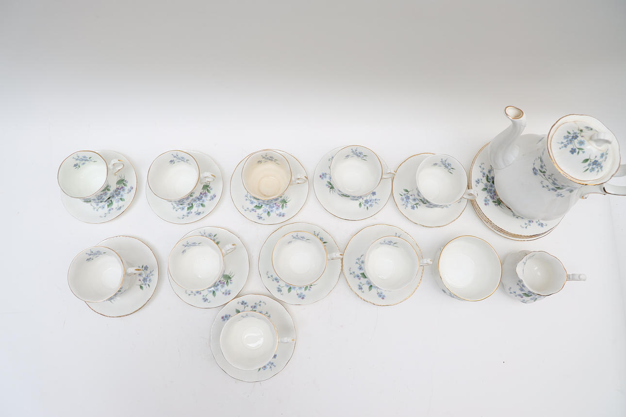 With printed floral decoration and gilding. 10 coffee cups 10 saucers 5 side plates Coffee pot, creamer, and sugar bowl.