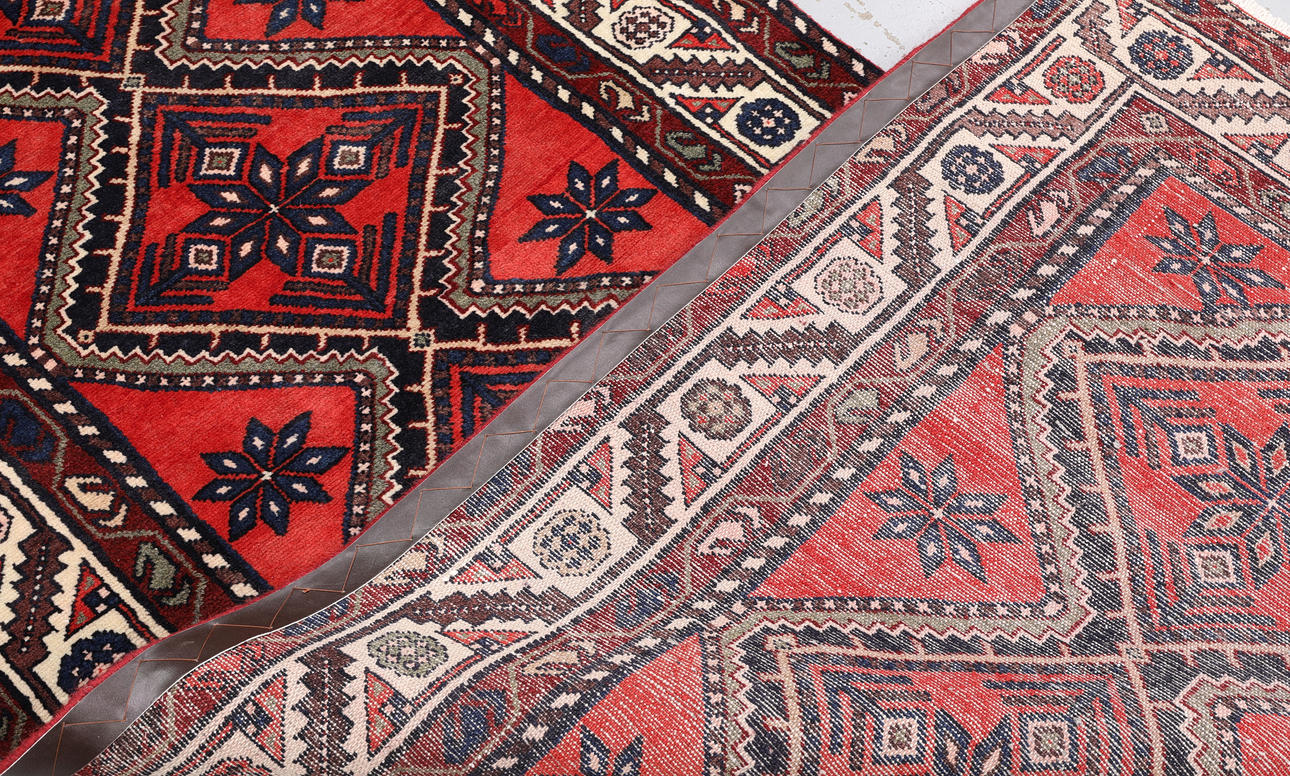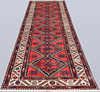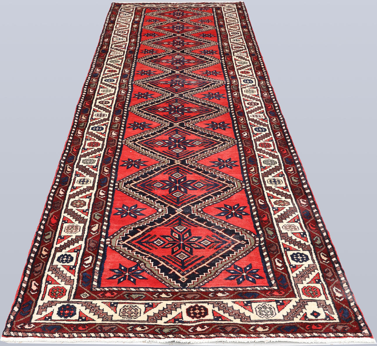 Hamadan runner with a red ground and a central field composed of diamond-shaped sections and geometric motifs in dark blue and beige. The border has a light ground with repeating geometric shapes in red, blue, and beige. Wool pile on a cotton warp.