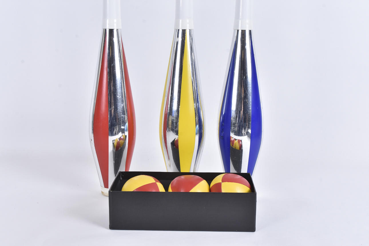 JUGGLING CLUBS AND BALLS, 2 boxes.