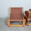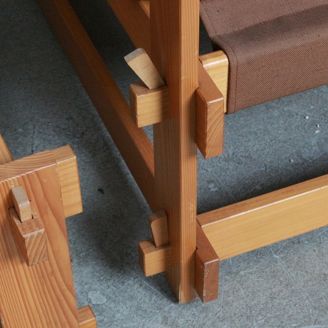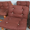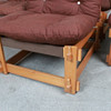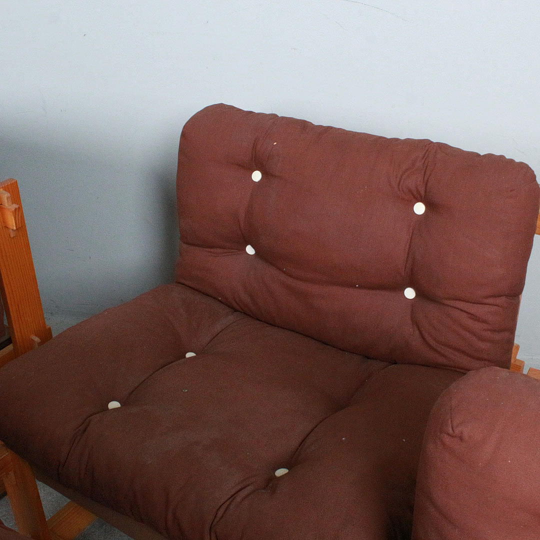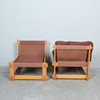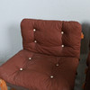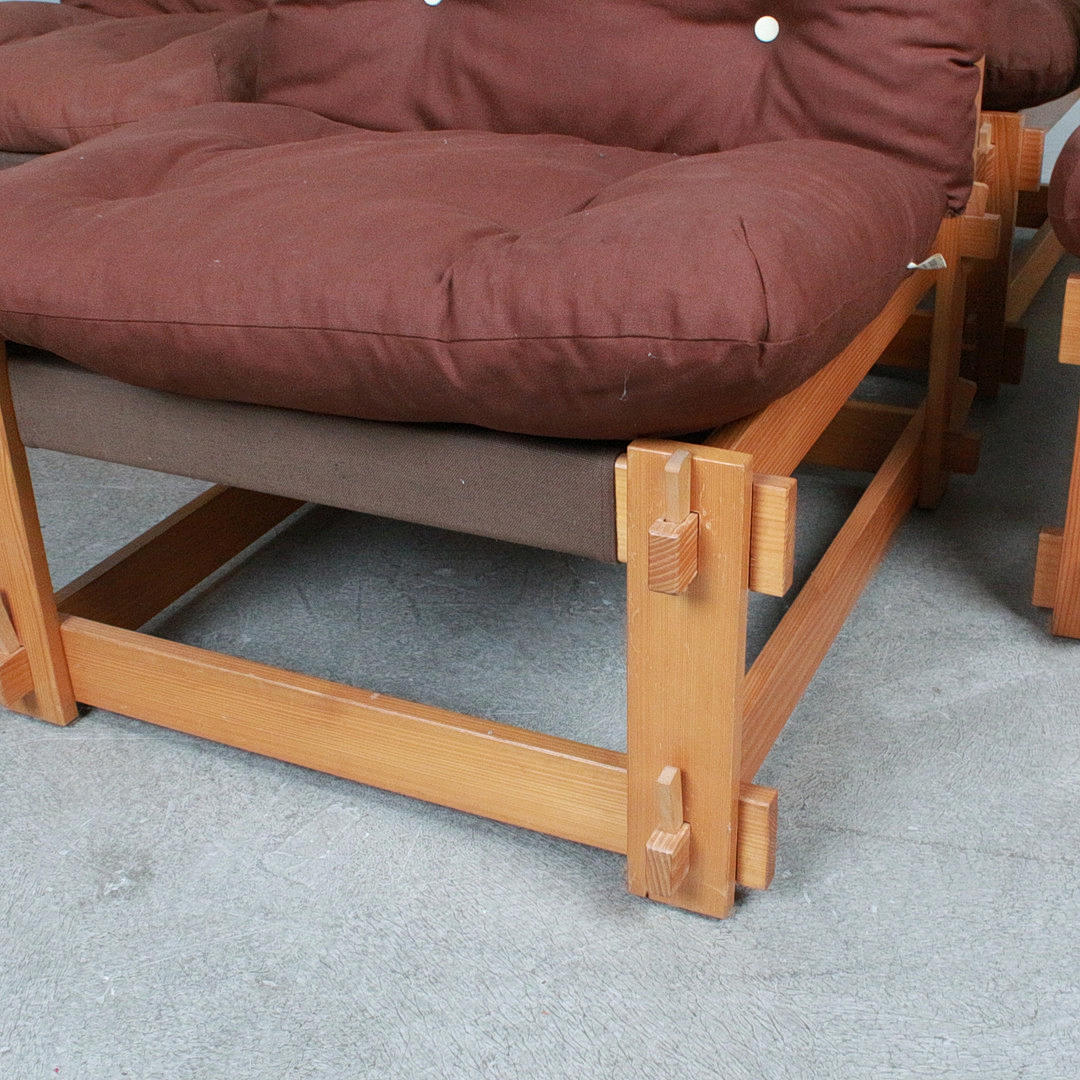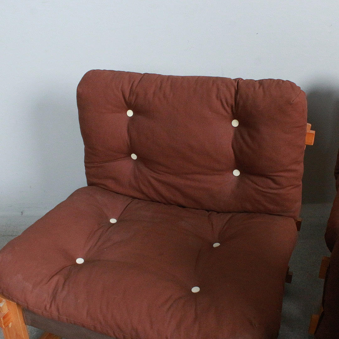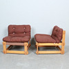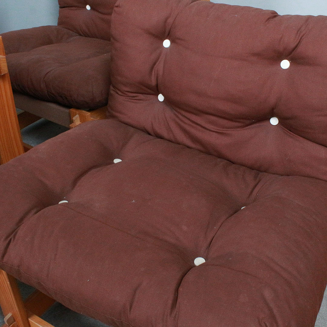 Four lounge chairs with brown upholstery. Crafted from pine. Dimensions: H. 72.5 cm, W. 70 cm, D. 75 cm, SH. 45 cm.