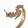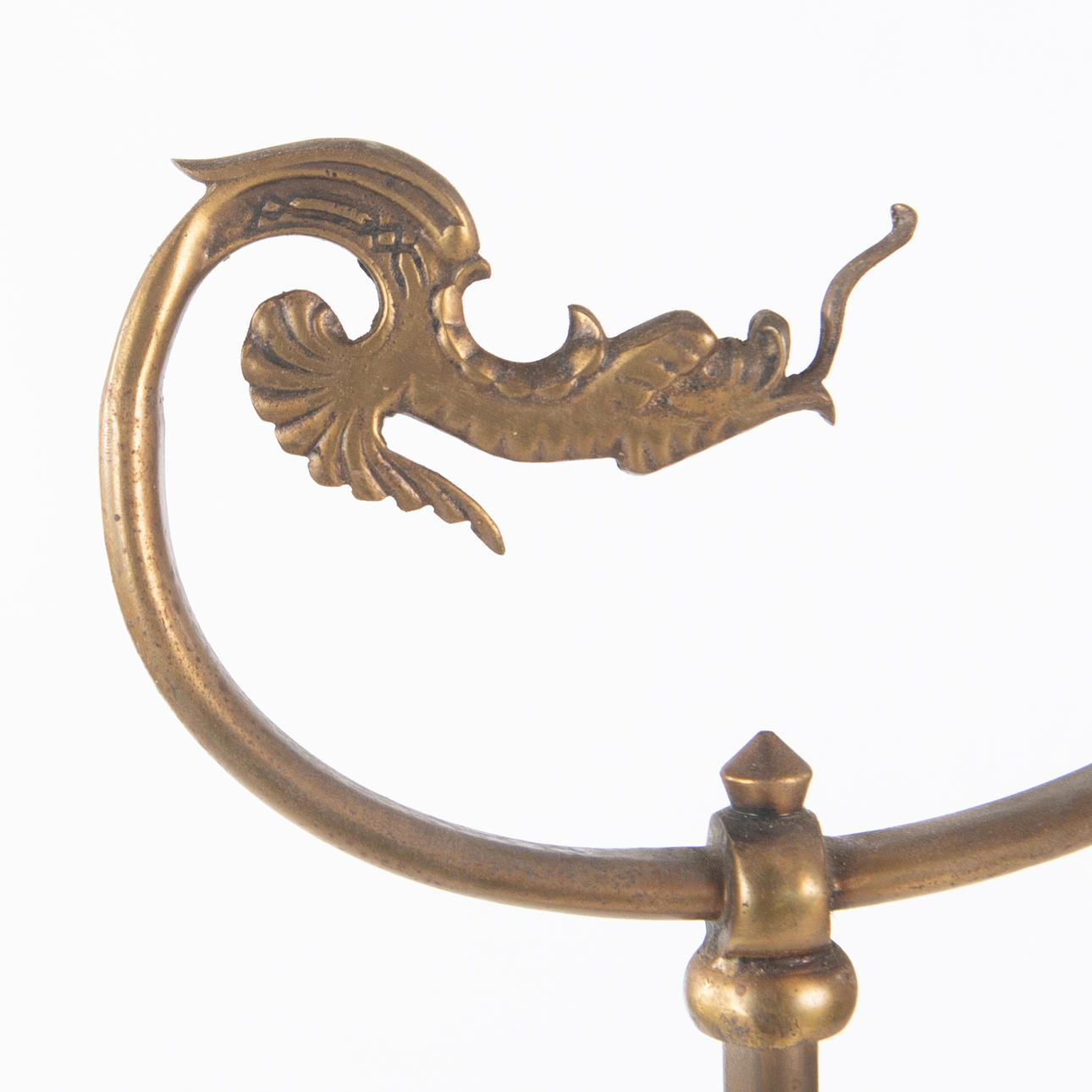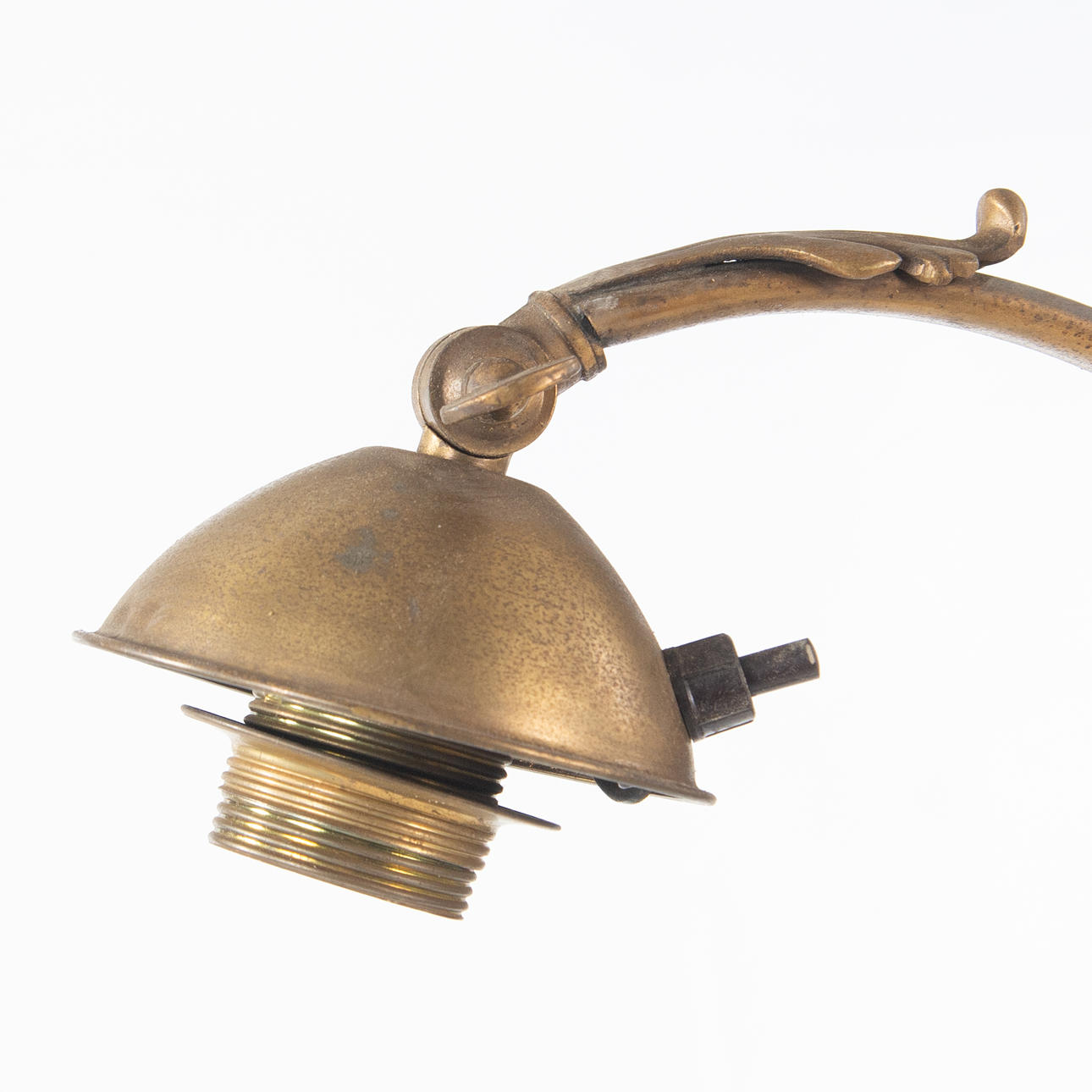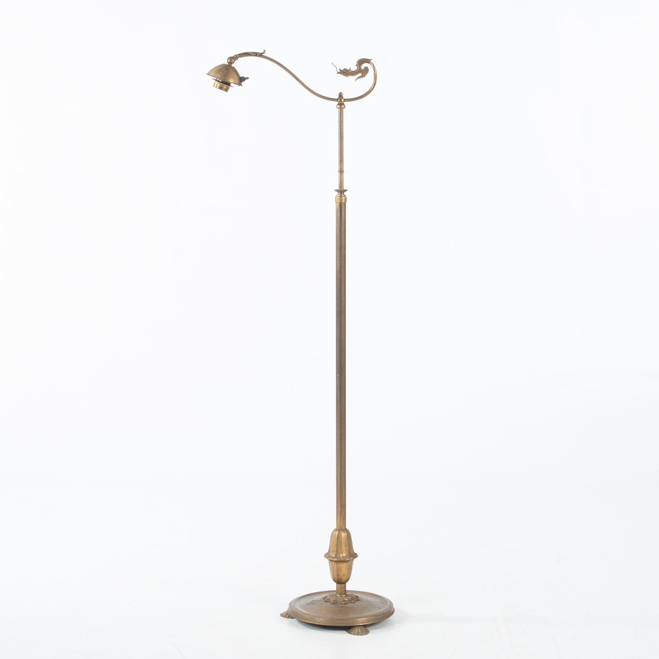 Height-adjustable model in patinated metal. Round base on paw feet, fluted transition and decorative arm with a stylized dragon. Adjustable lamp head.