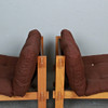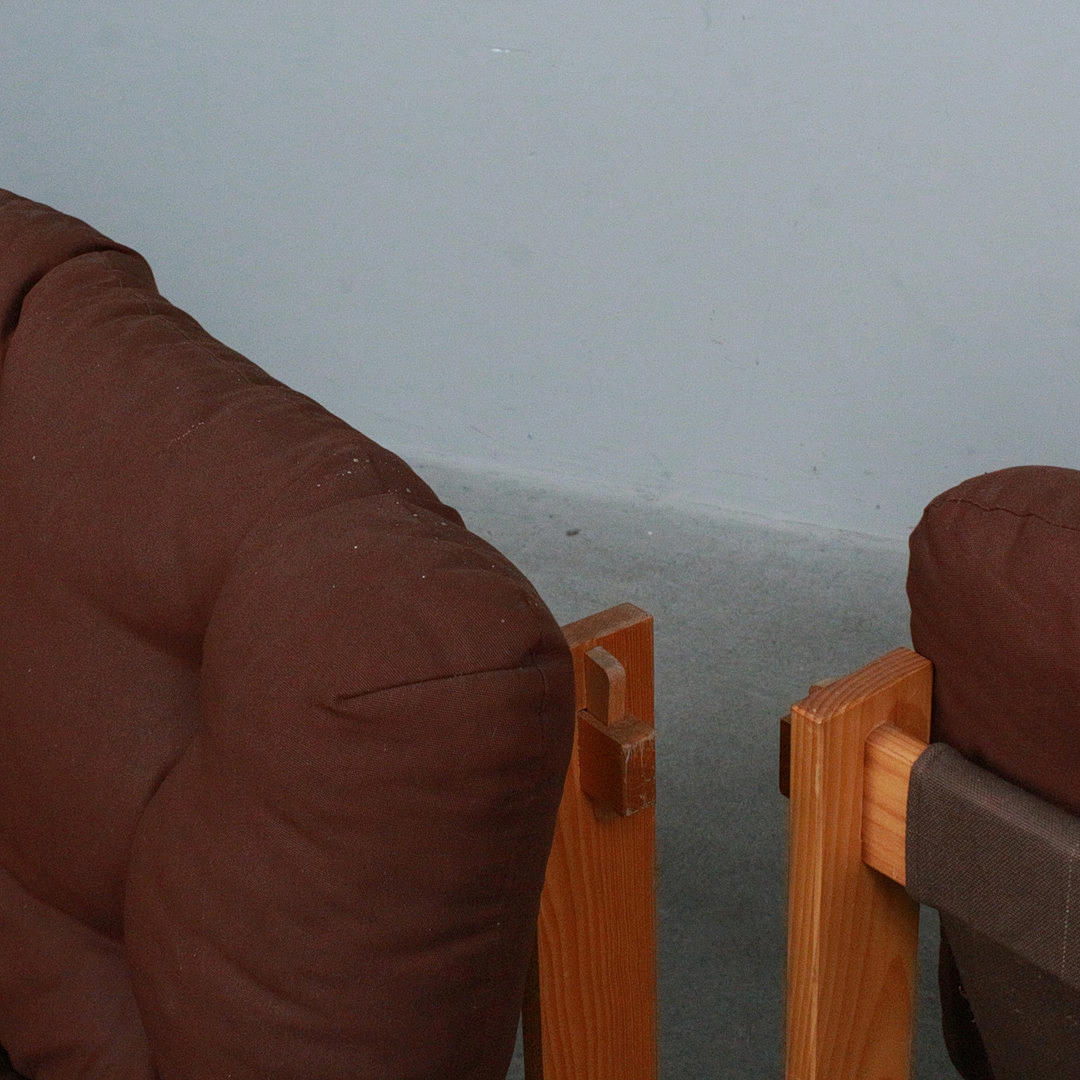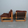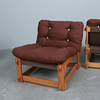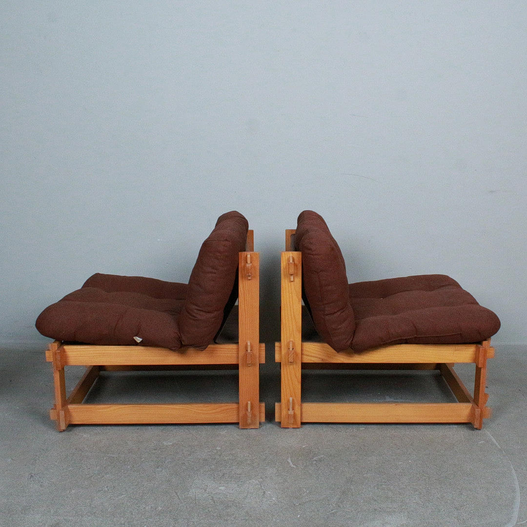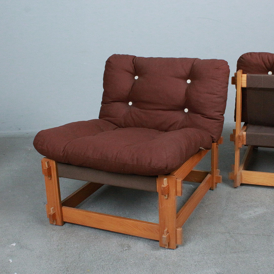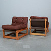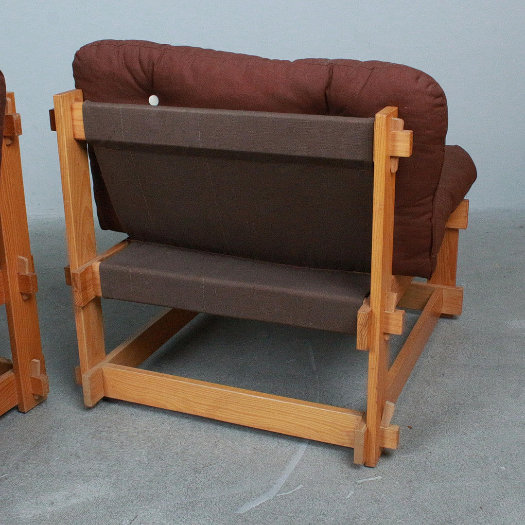 Two lounge chairs with brown upholstery, Crafted from pine wood. Dimensions: H. 72.5 cm, W. 70 cm, D. 75 cm, SH. 45 cm.