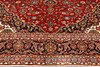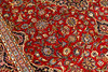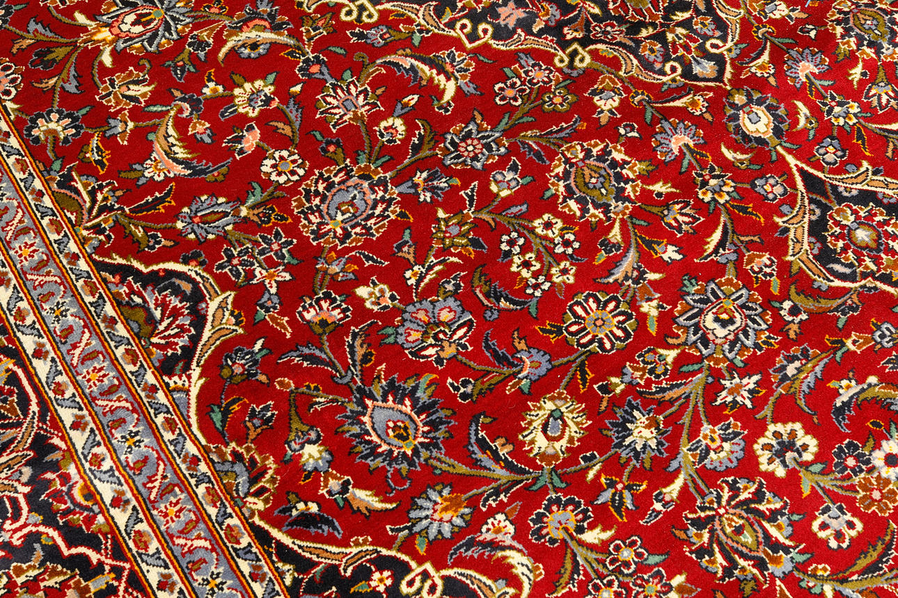 Keshan with a red ground and a centrally placed medallion in blue and beige, with details in green and red. The field is covered with floral ornamentation, palmettes, and arabesques in similar shades, and the corners follow the same color scheme as the medallion. The border has a dark ground and decoration of palmette vines. The pile is wool and the warp is cotton.