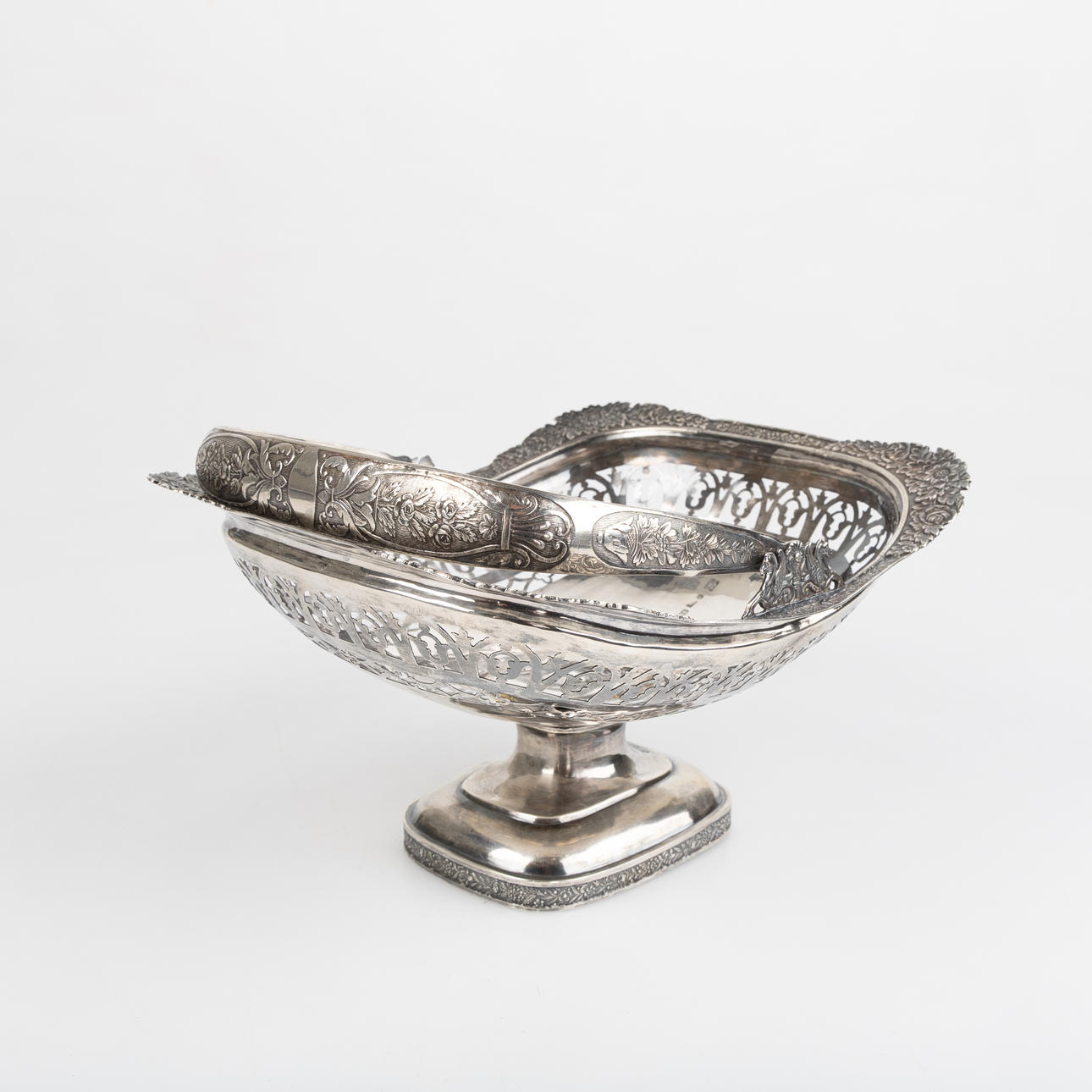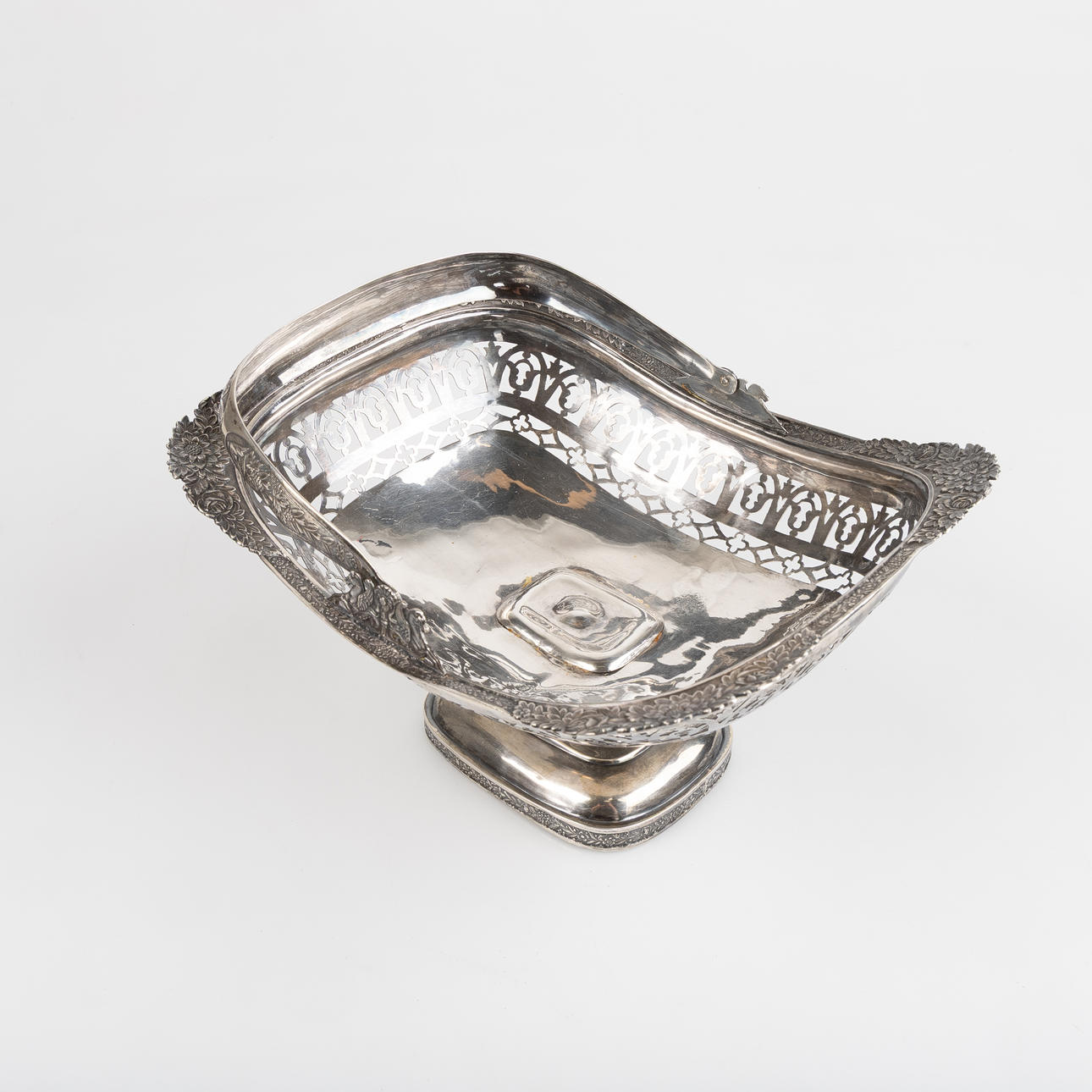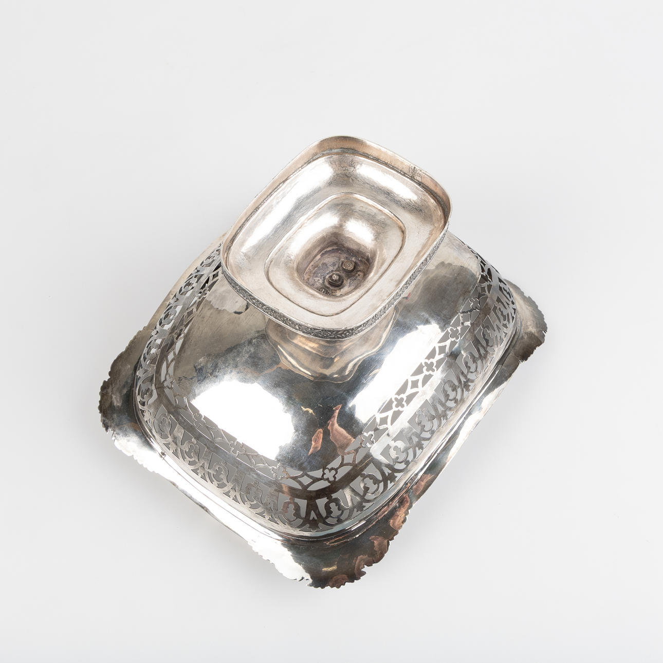 Weight approx. 423 g. Assayer MK (Mikail Mikaìlovich Karpinshiì), marked 84. Richly decorated with pierced pattern and floral details.