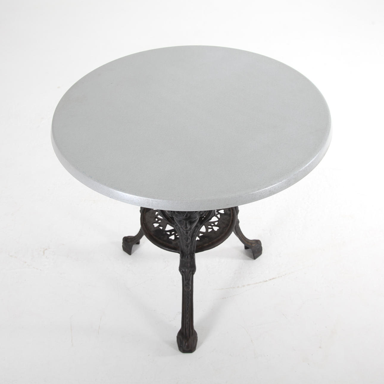 Garden table, blackened cast iron. Loose top in light grey fibreglass.