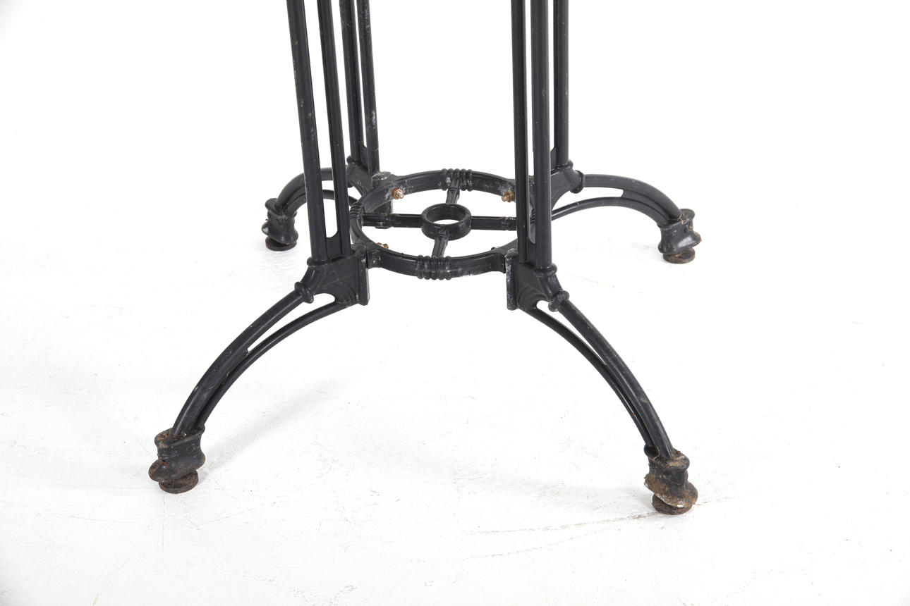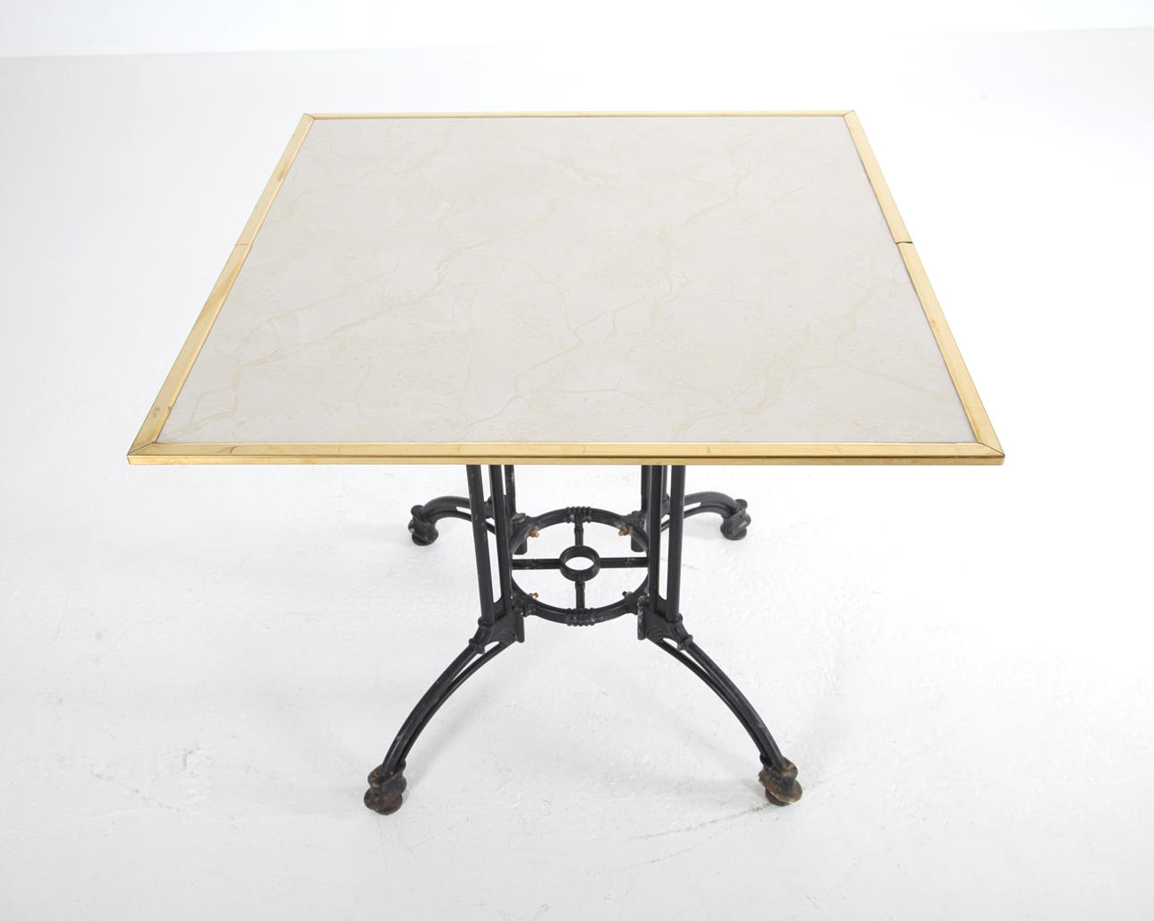 Table, blackened cast iron, fixed top in gesso/tile with brass-coloured trim. Height 71 cm Top dimensions 80 x 80 cm.