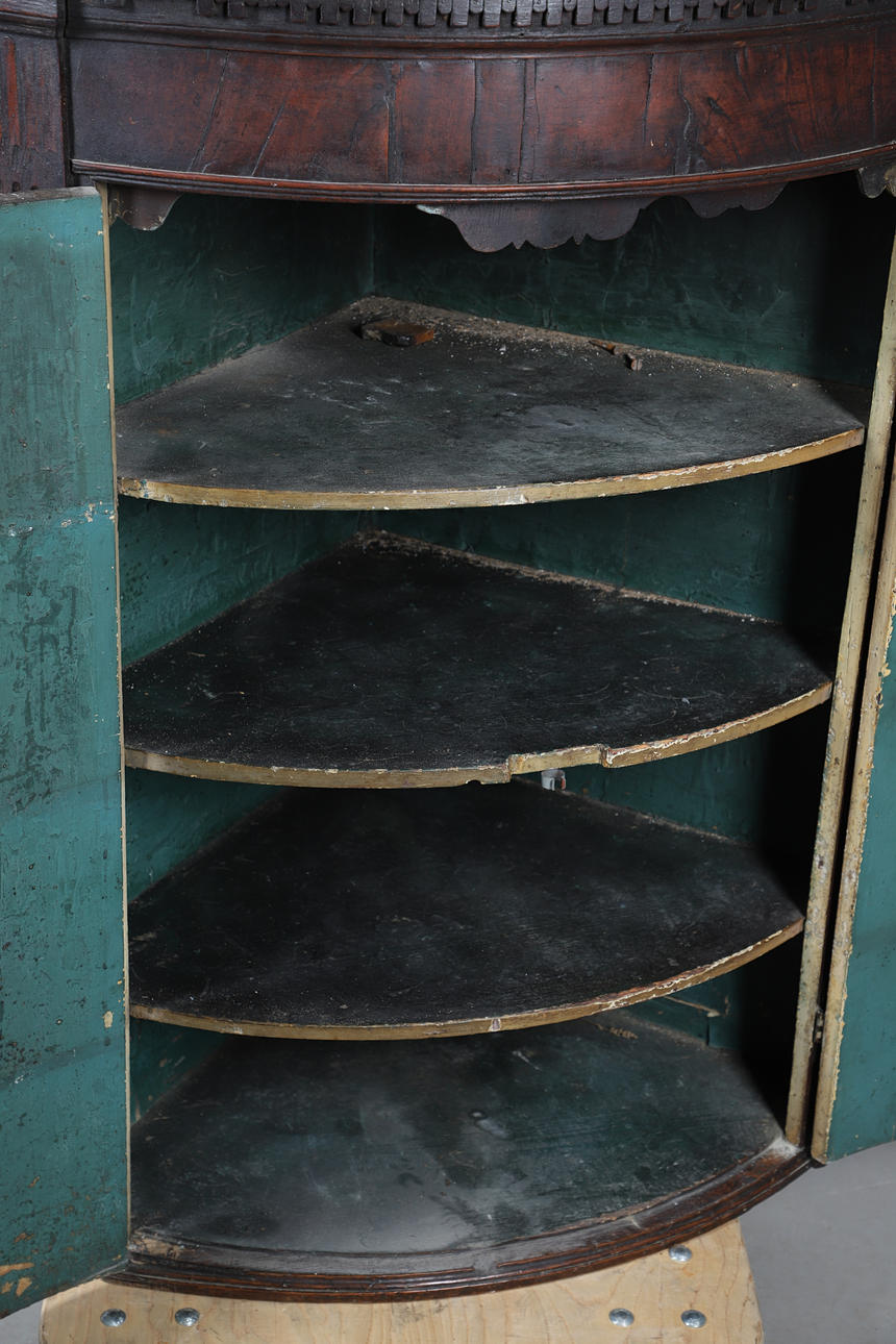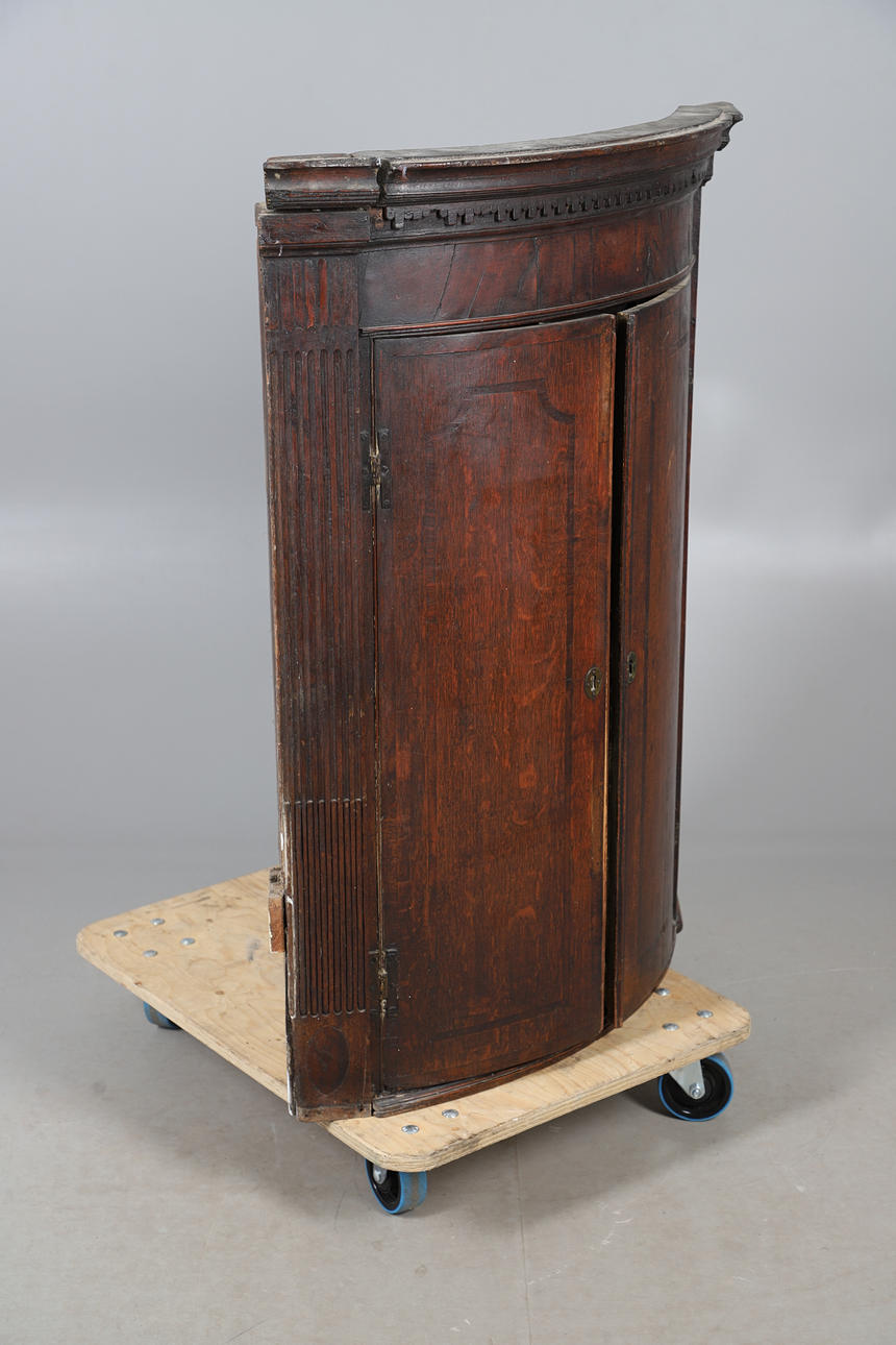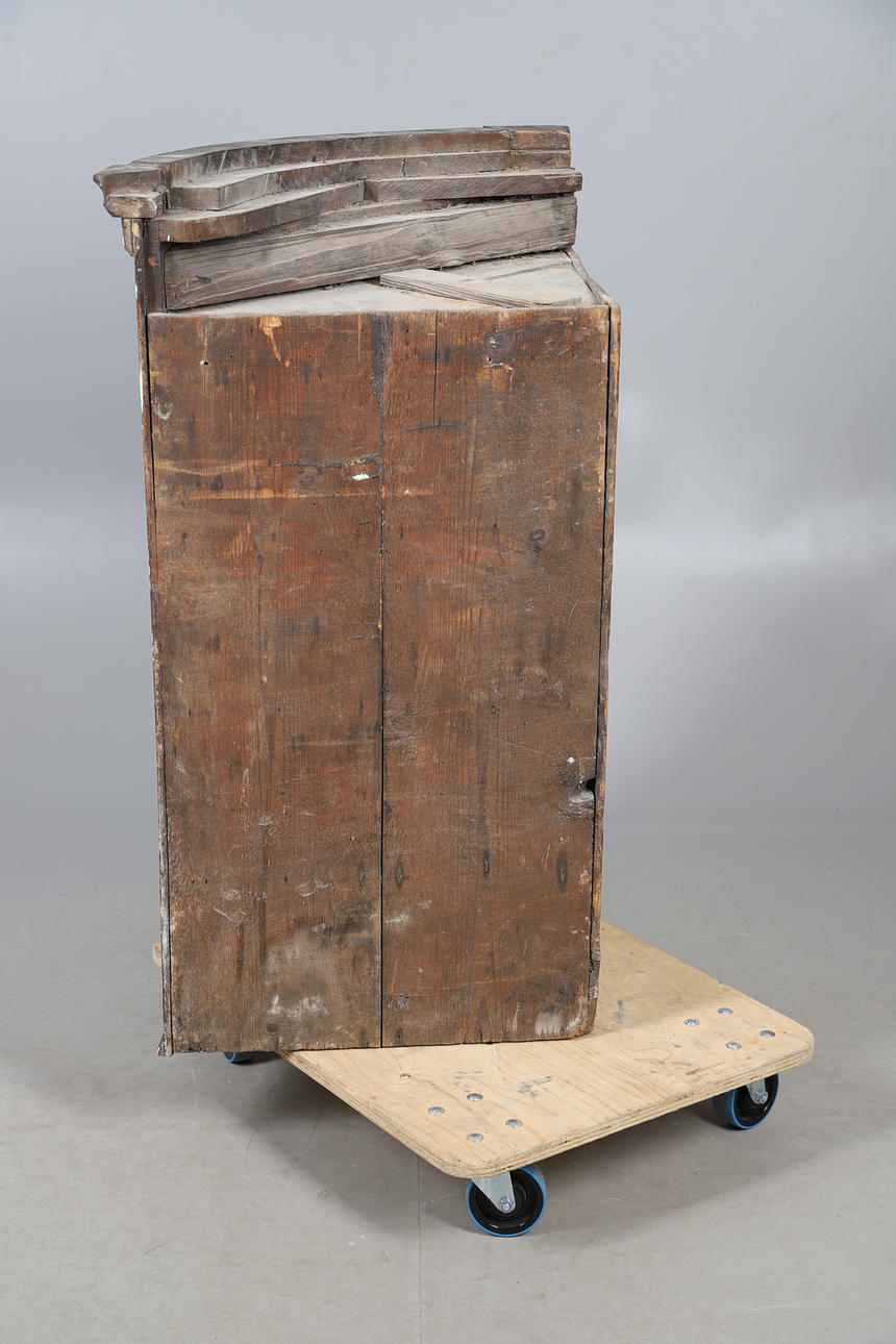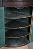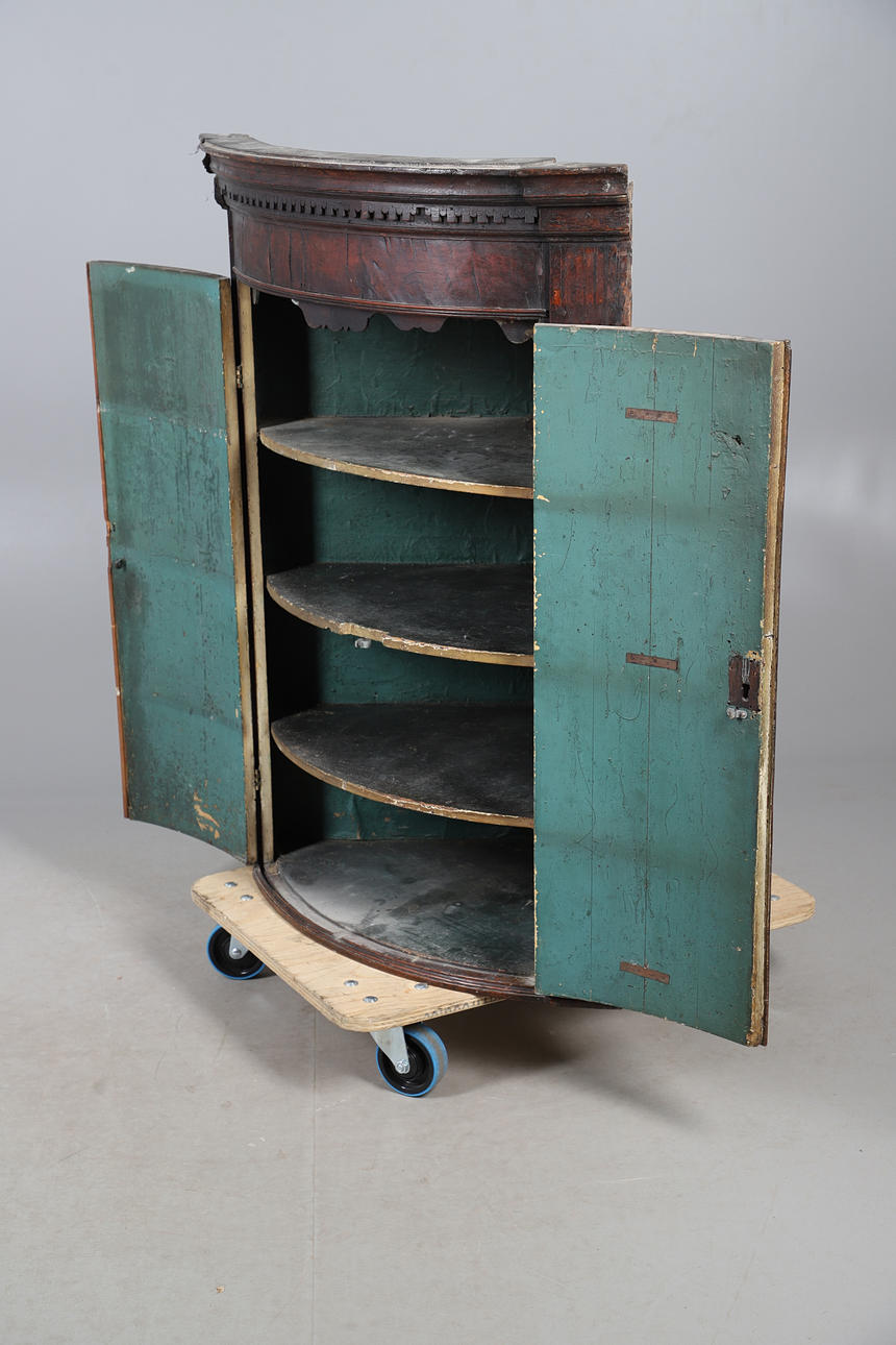 The two single doors opening to reveal three fixed shelves. Height 112cm, width 86cm, depth 62cm.