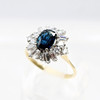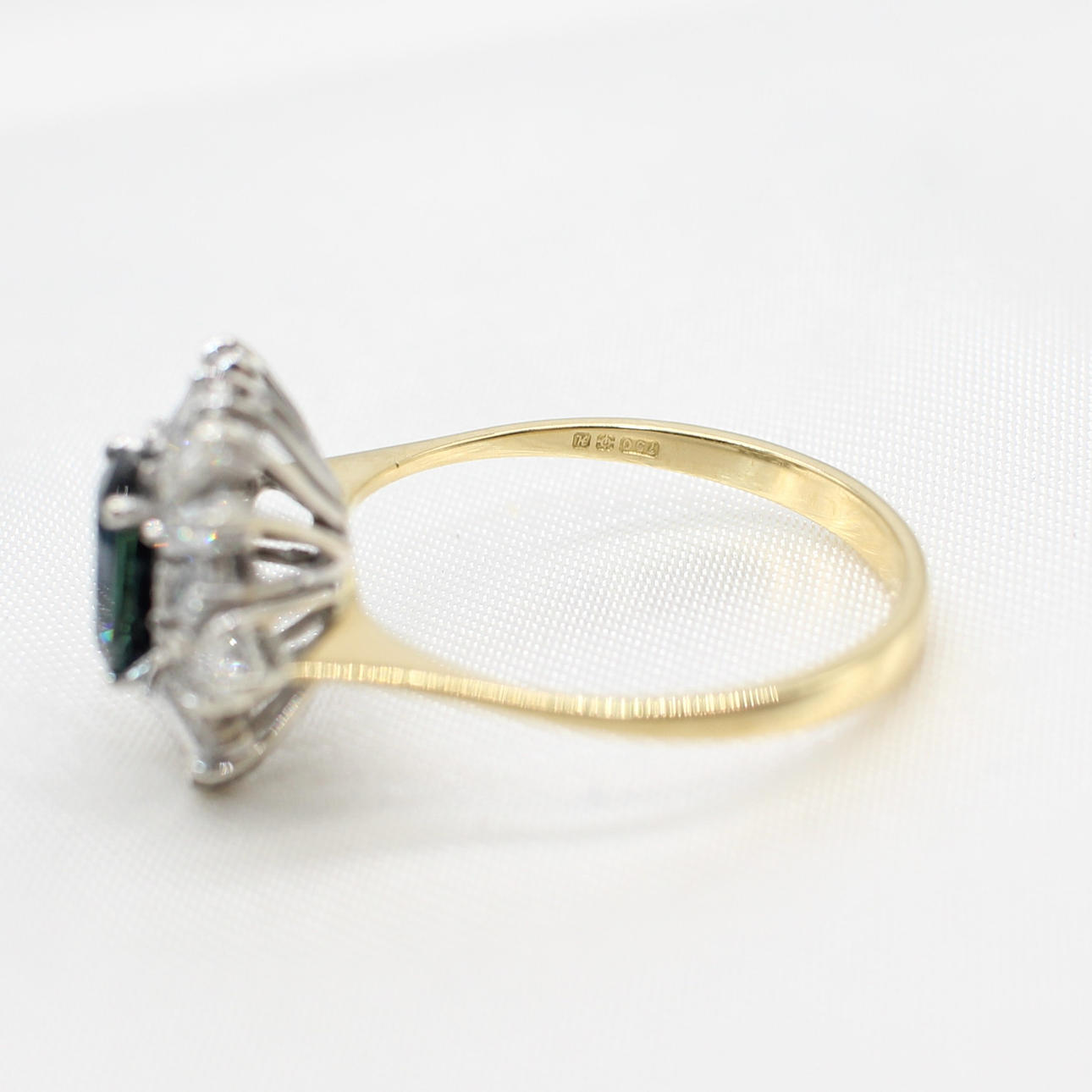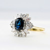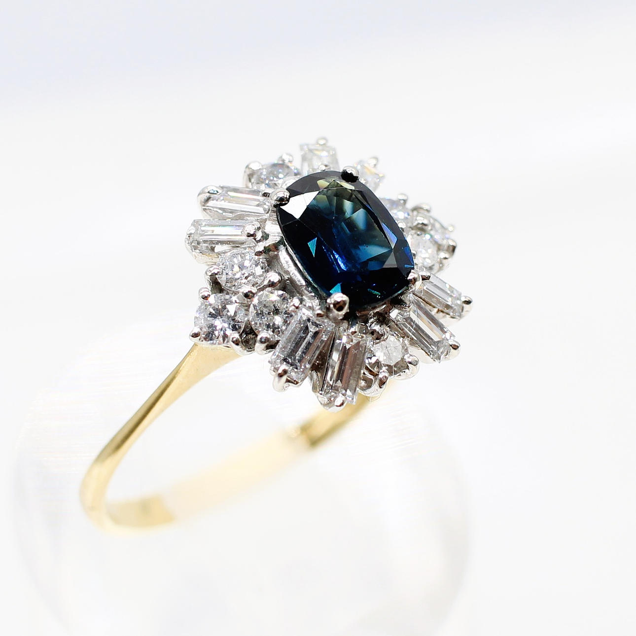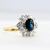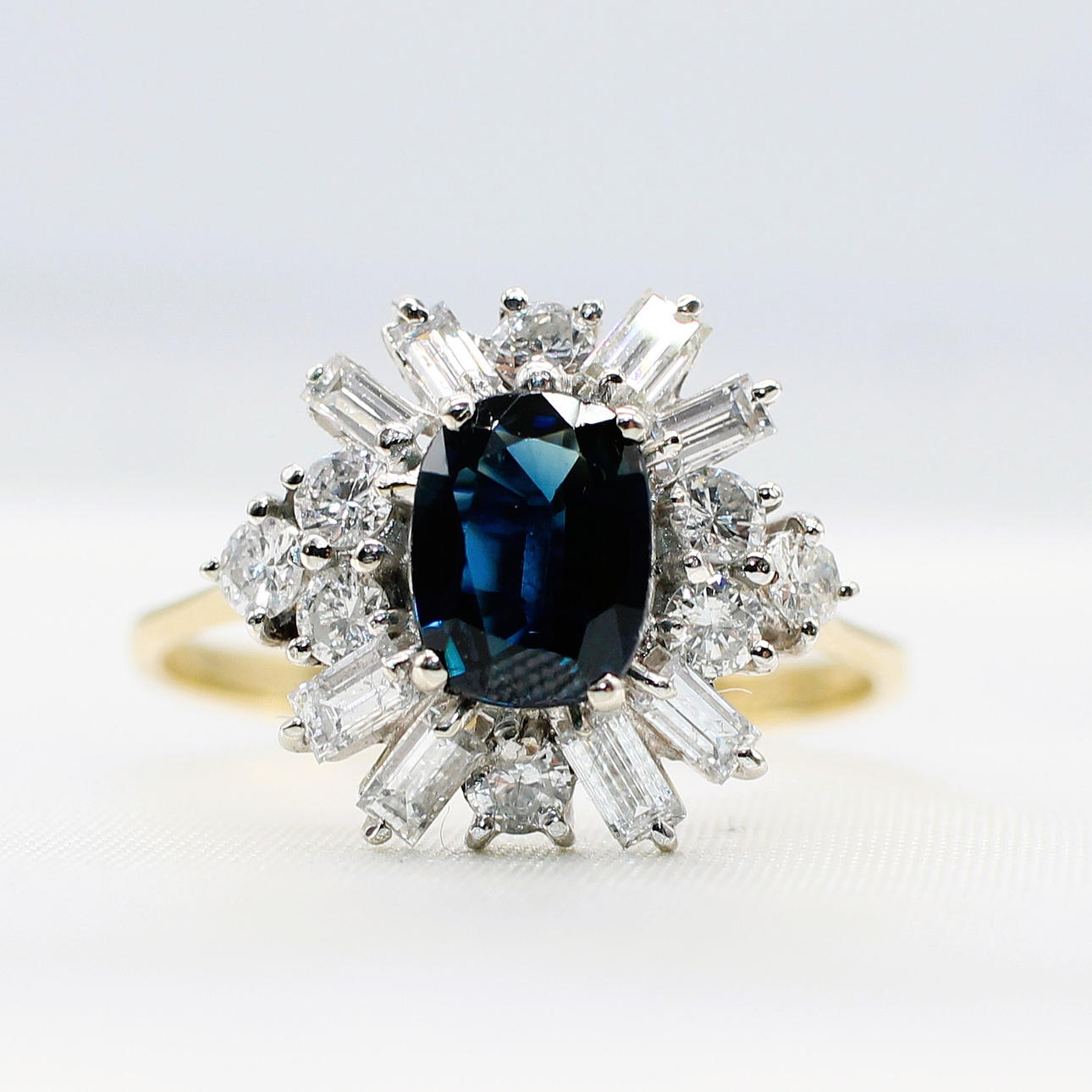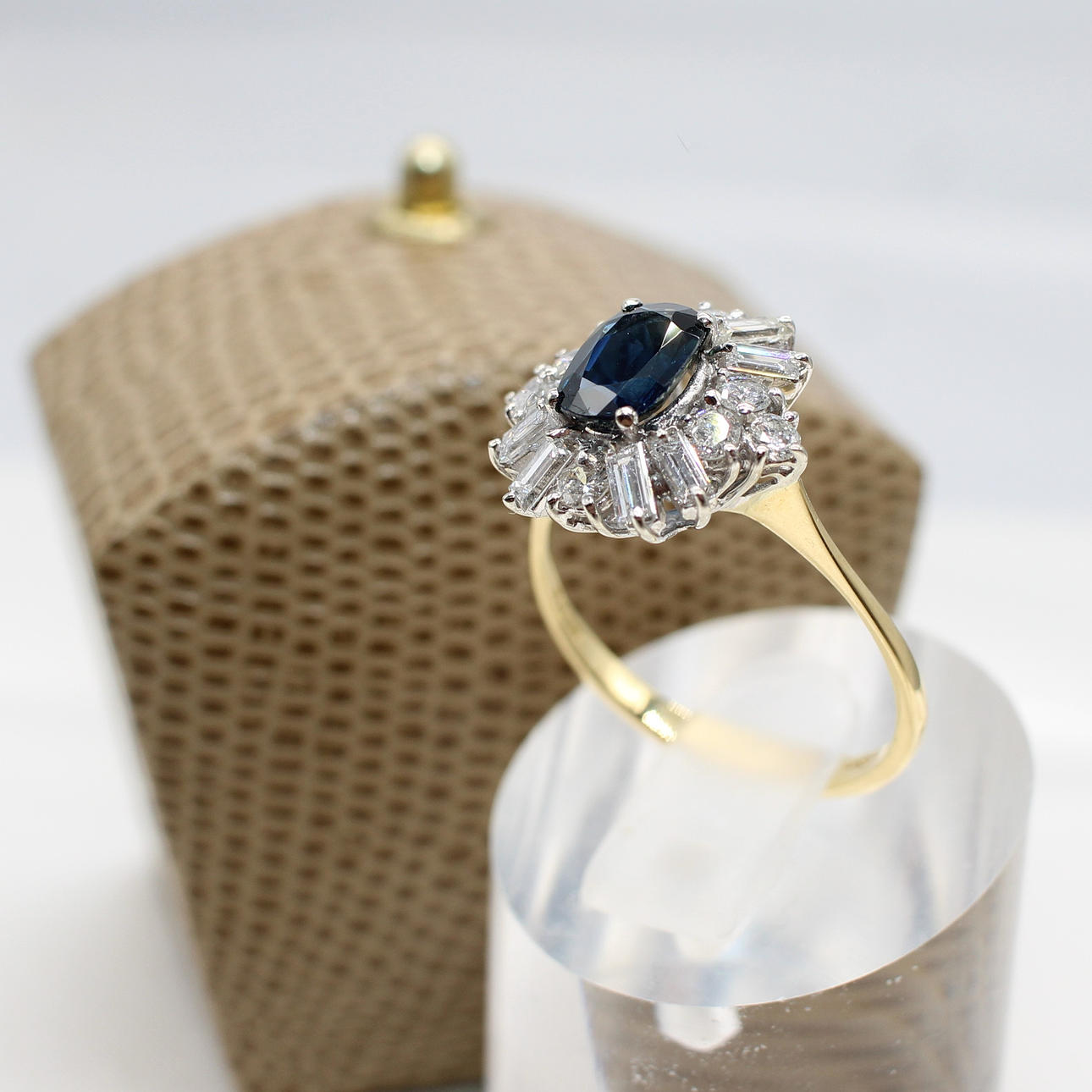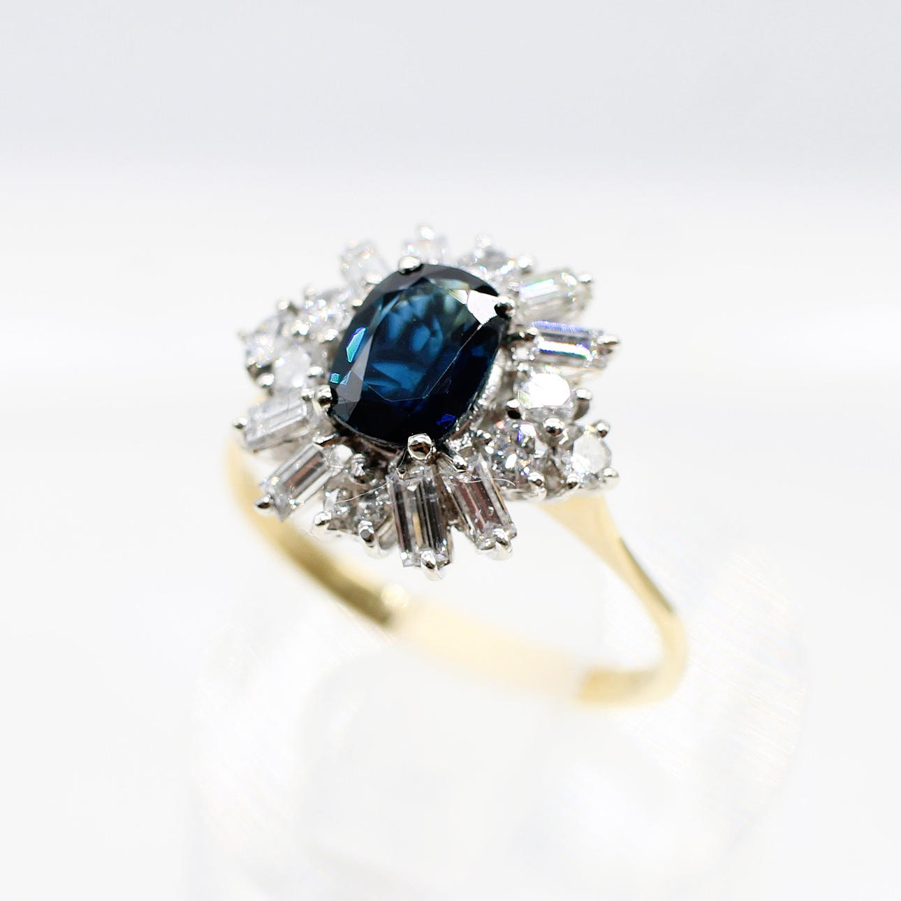 An 18ct Yellow And White Gold (Hallmarked) Cluster Ring Set With An Oval Cut Sapphire And Baguette And Round Brilliant Cut Diamonds.