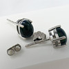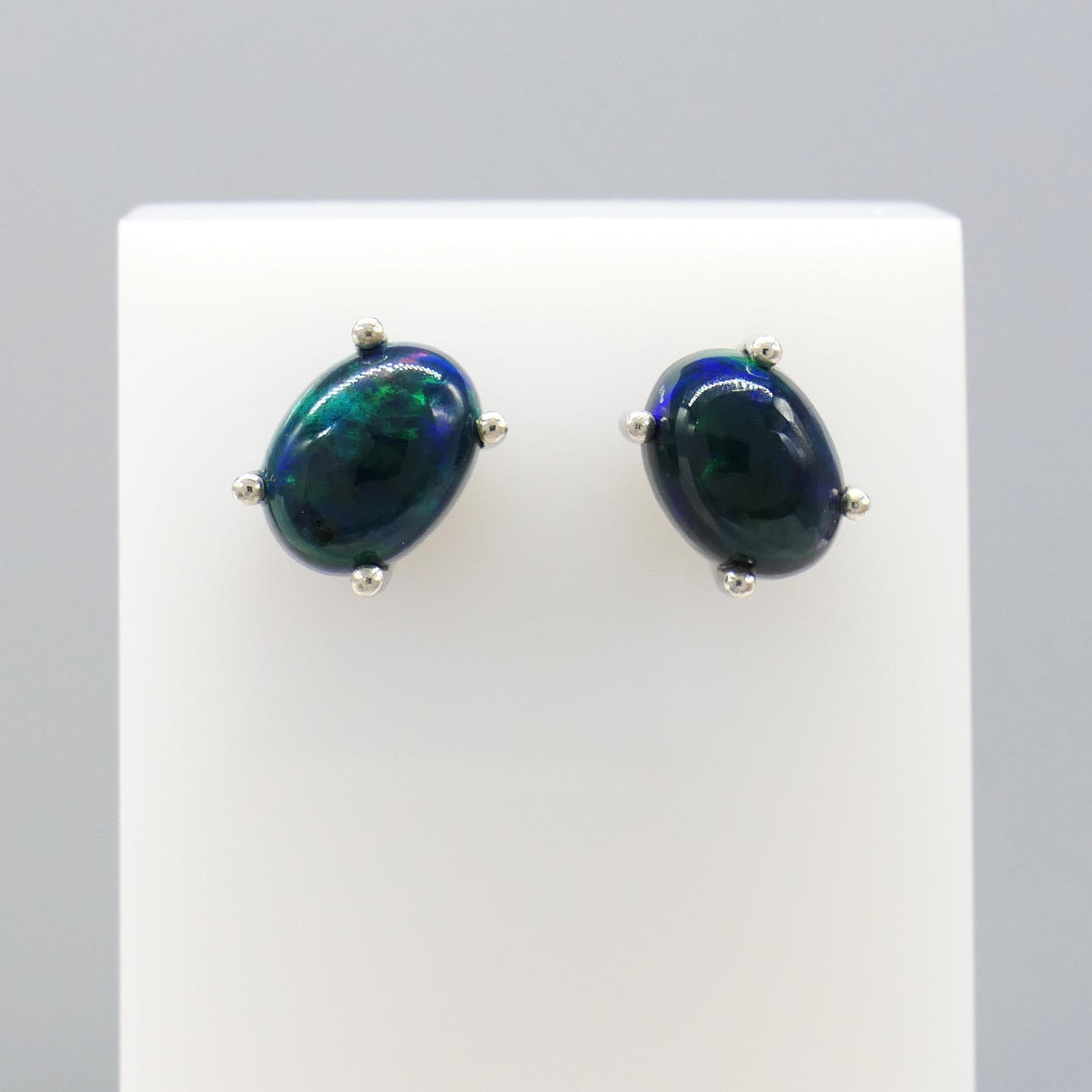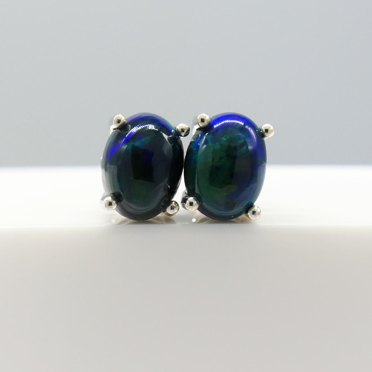 Gemstones: Ethiopian black opal; natural; oval cabochon cut; 1.50ct total approx; 8 x 6mm each; green, blue, red and orange colour aurora-style reflections