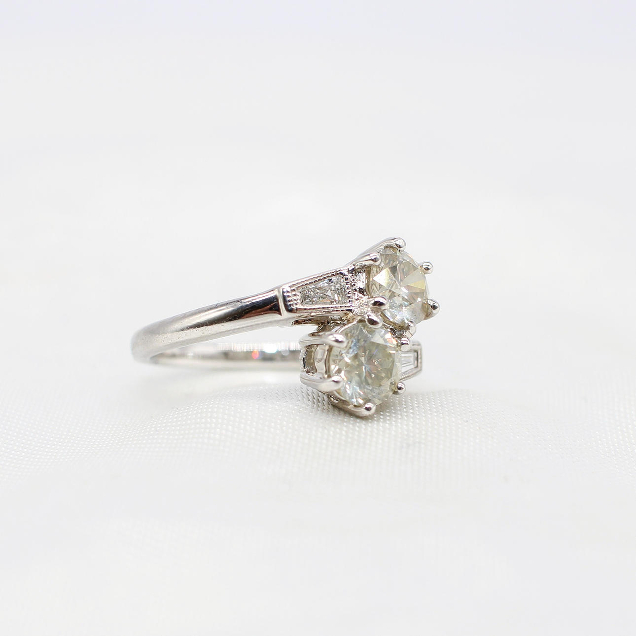 An Independently Certified 18K White Gold (Hallmarked) Ring Set With 2 x Central Round Brilliant Cut Diamonds And A Further 2 X Tapered Baguette Cut Shoulder Diamonds.