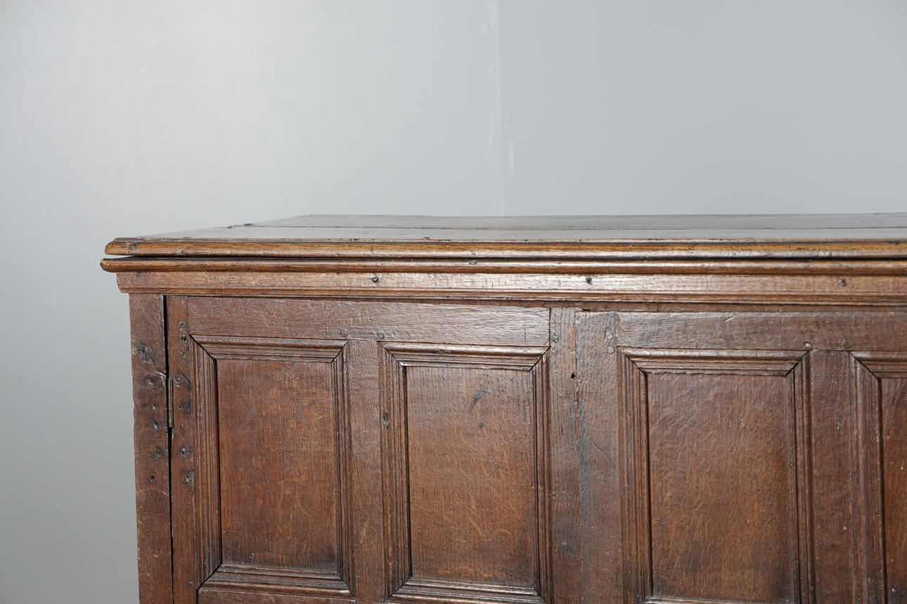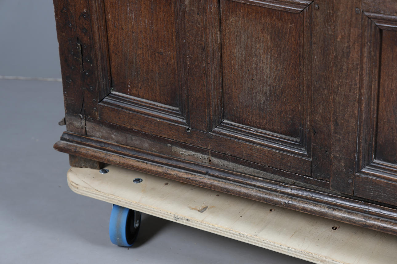 With some chips and losses, glued plank split to top, a loose moulding, signs of restoration and a little woodworm, otherwise expected wear, marks and scratches.