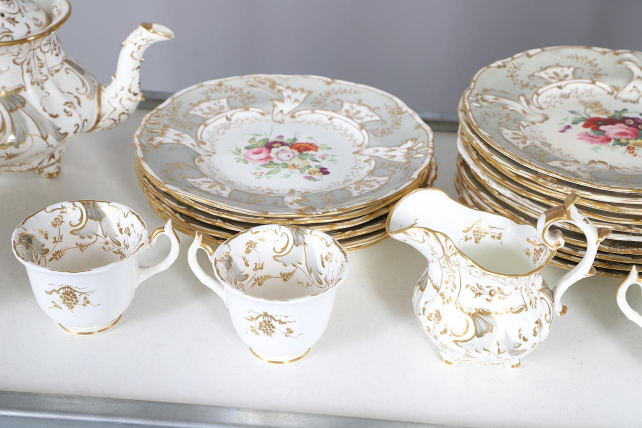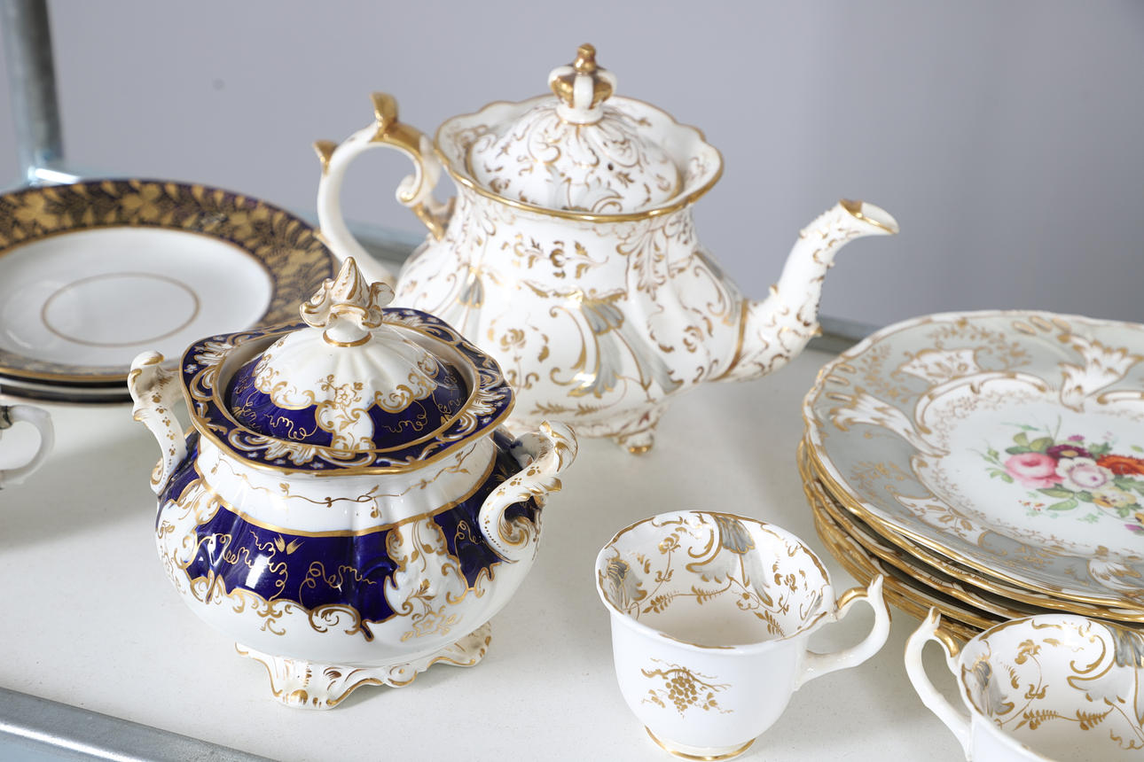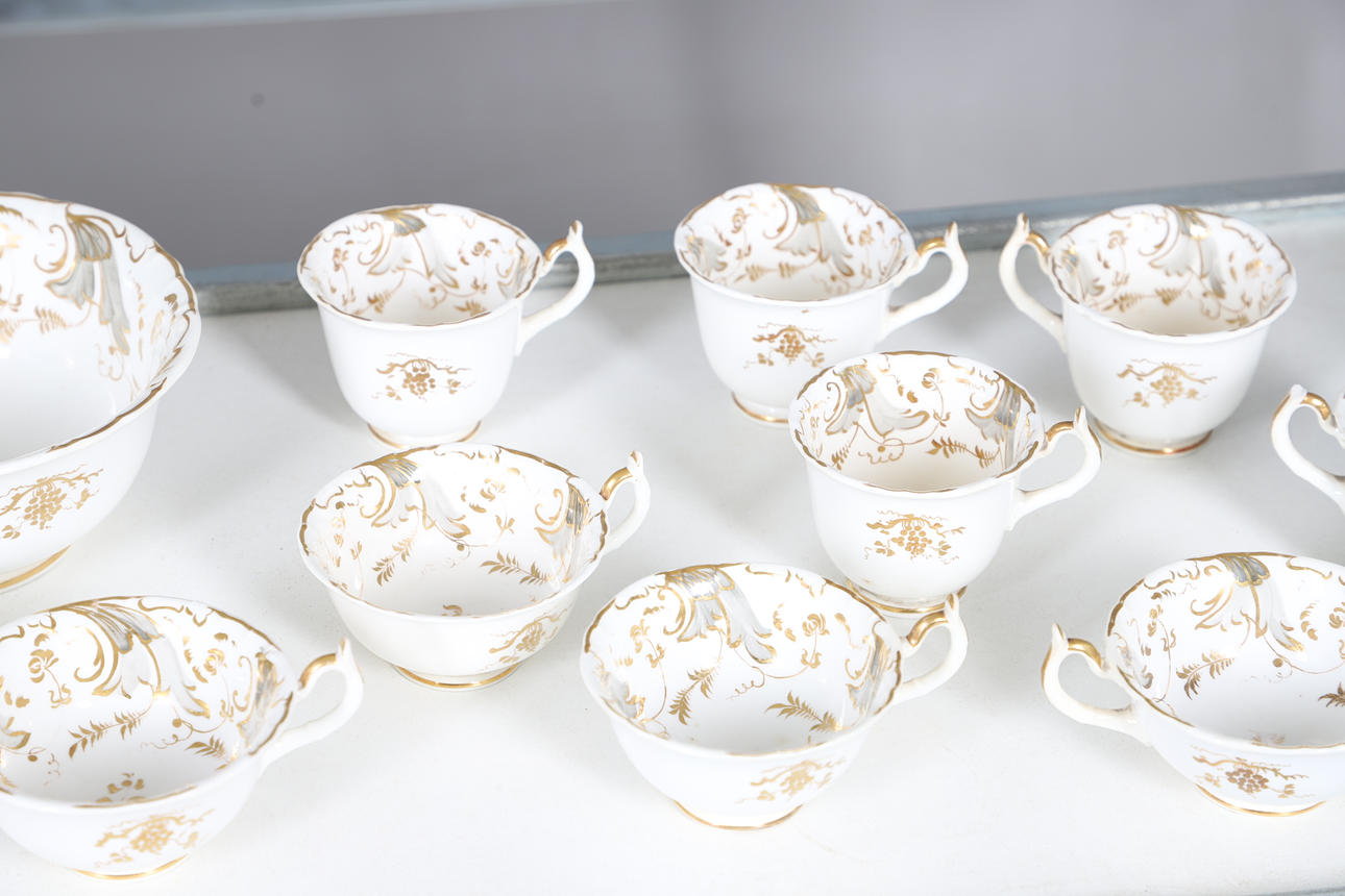 A large mixed dinner service, comprising of a gold and white part tea service, and another part dinner service of a different pattern, as well as a cheese dish and a small collection of floral dinner plates. Size of tea pot, 18cm high. (QTY).