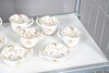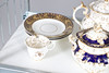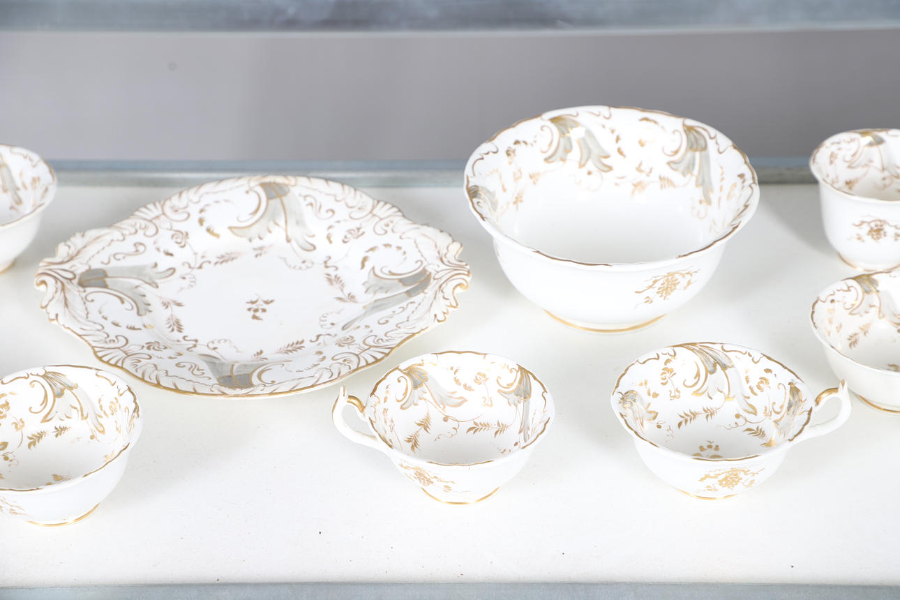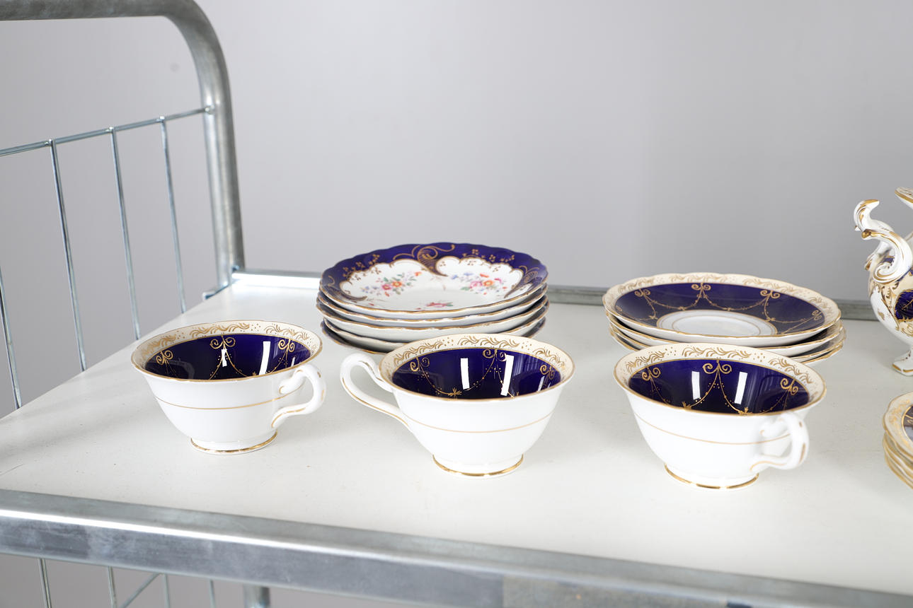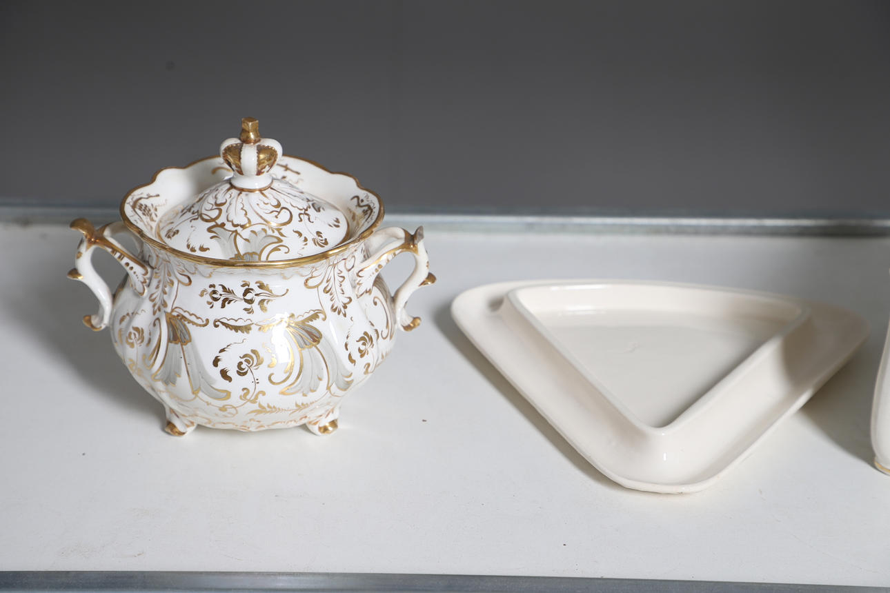 A large mixed dinner service, comprising of a gold and white part tea service, and another part dinner service of a different pattern, as well as a cheese dish and a small collection of floral dinner plates. Size of tea pot, 18cm high. (QTY).