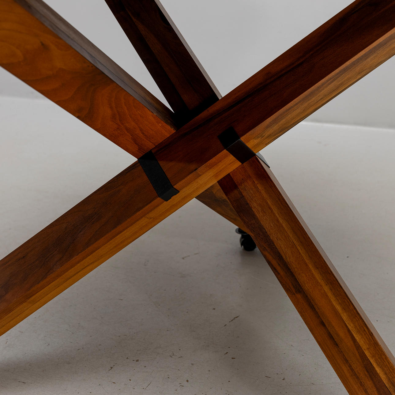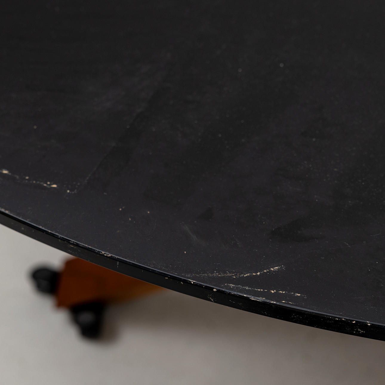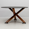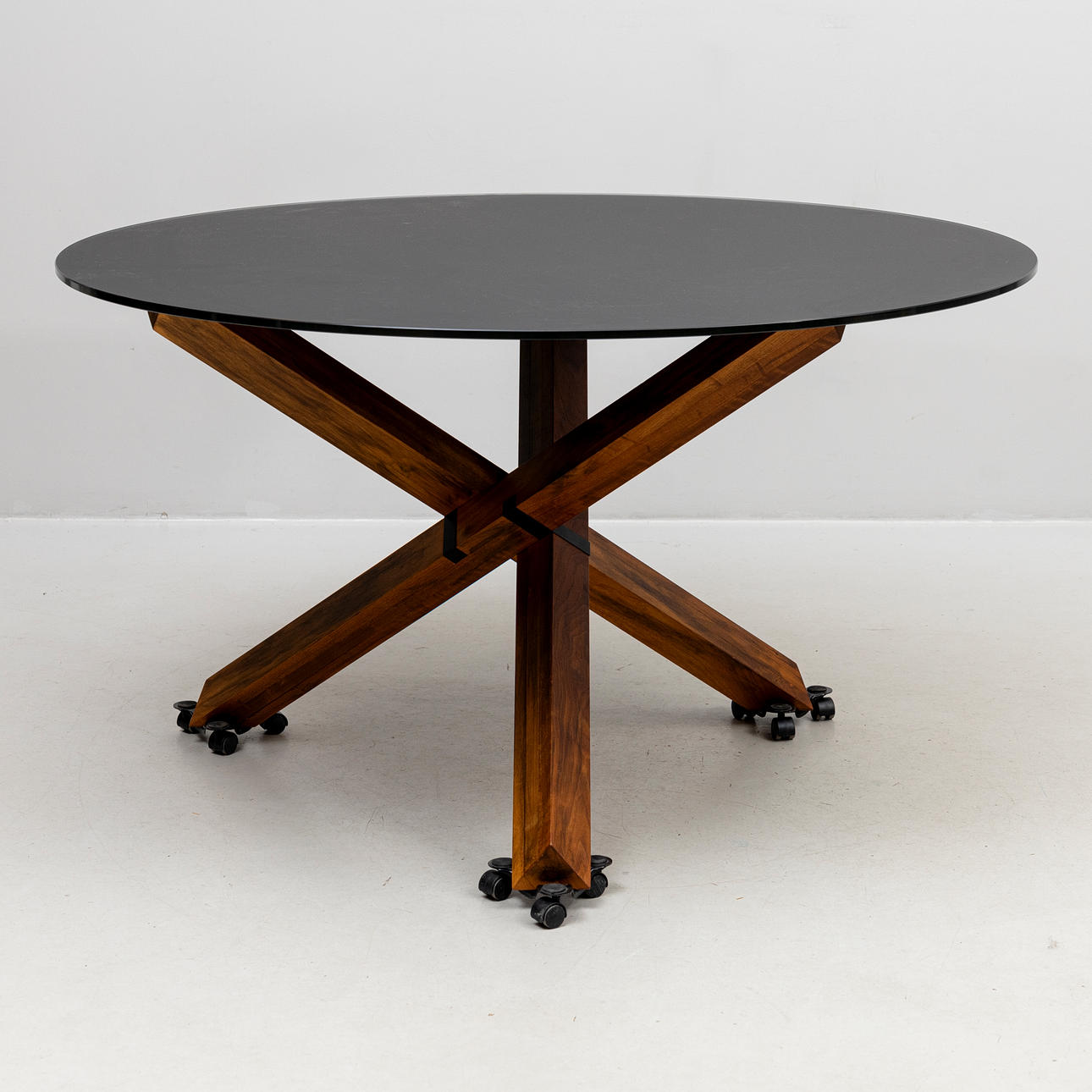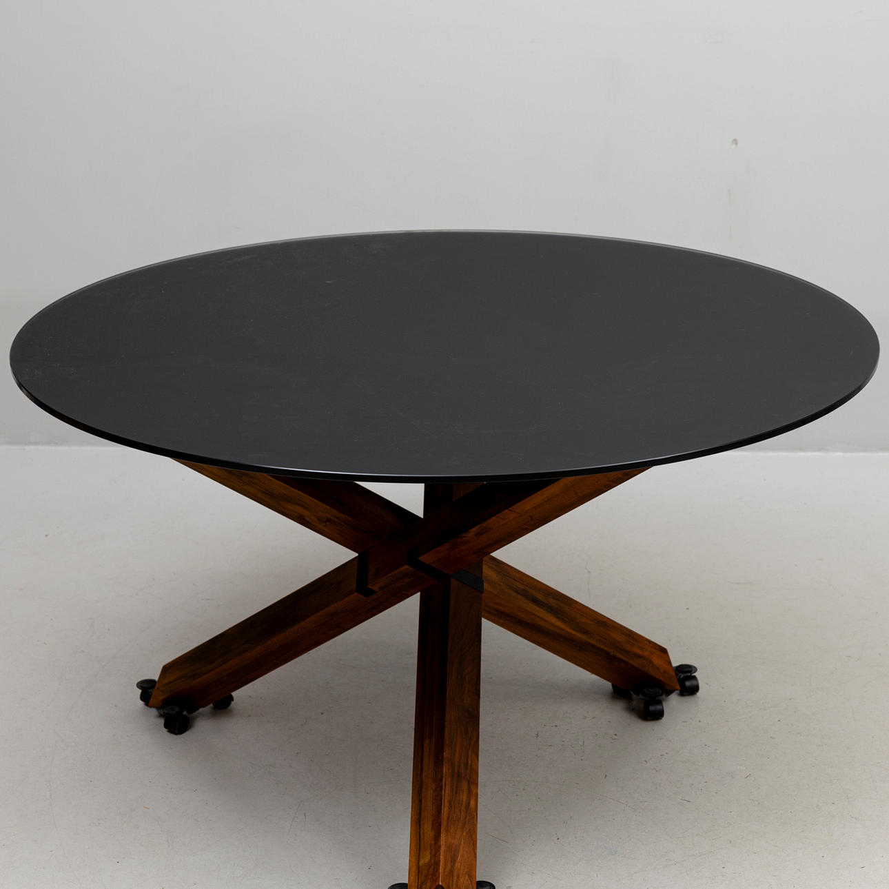On a base of stained wood, black, frosted glass top. Diameter approx. 135, height 75 cm.