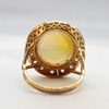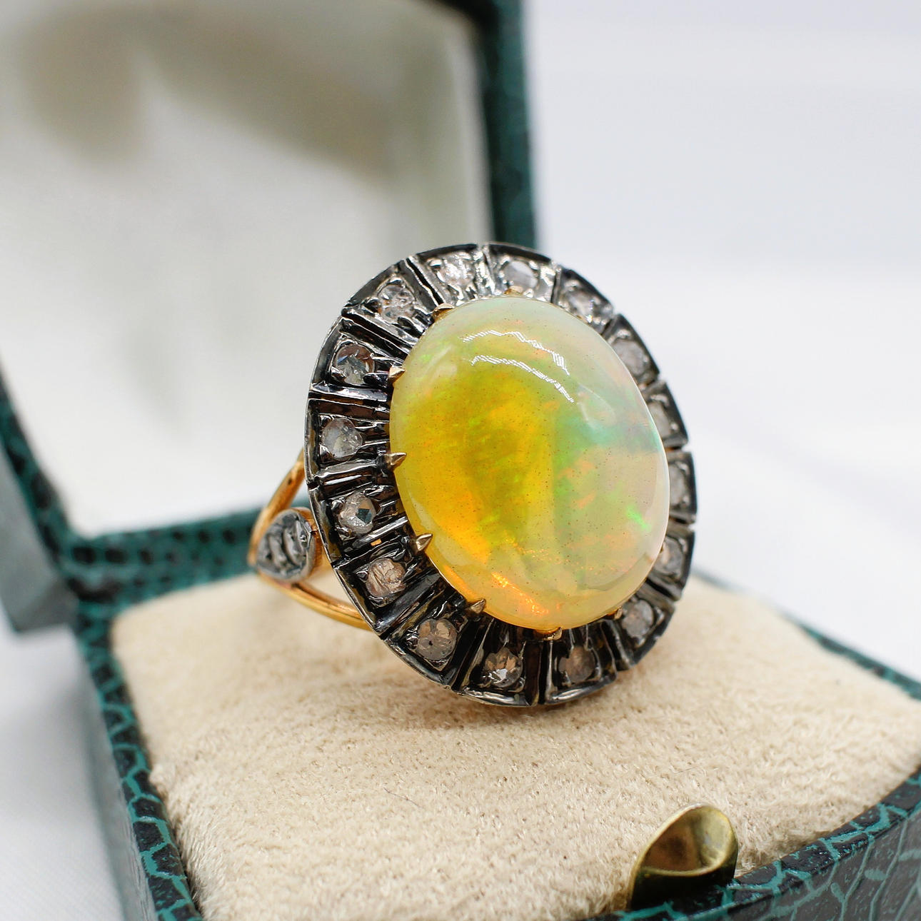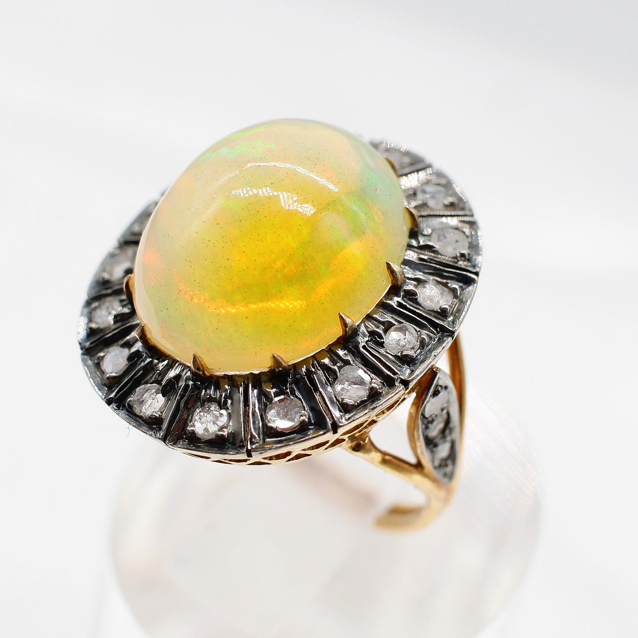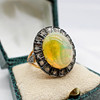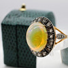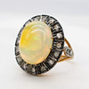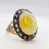 A 14K vintage style yellow gold (stamped 585) and silver (stamped 925) cabochon Ethiopian opal and rose cut diamond ring.