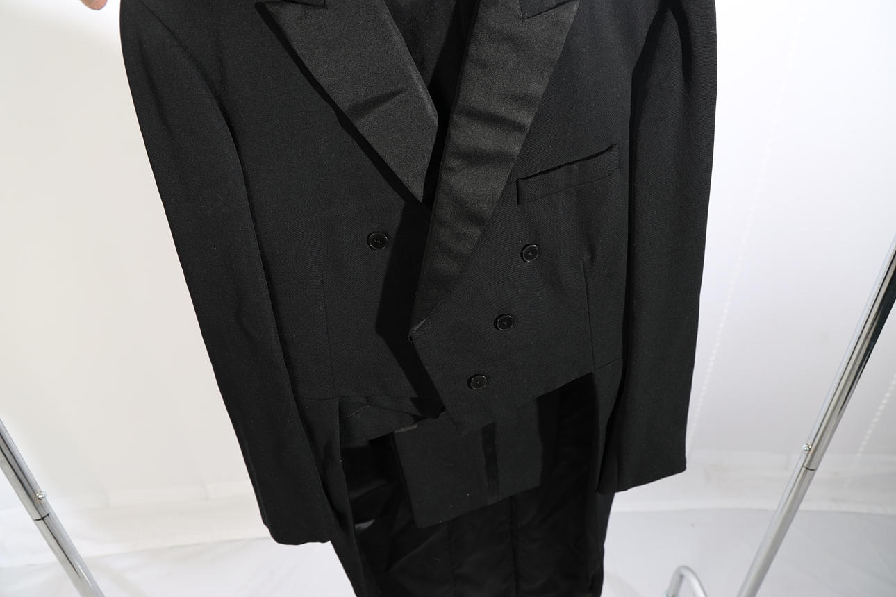 Tailcoat, waistcoat, trousers, bow tie and cummerbund. Length approximately 113 cm.