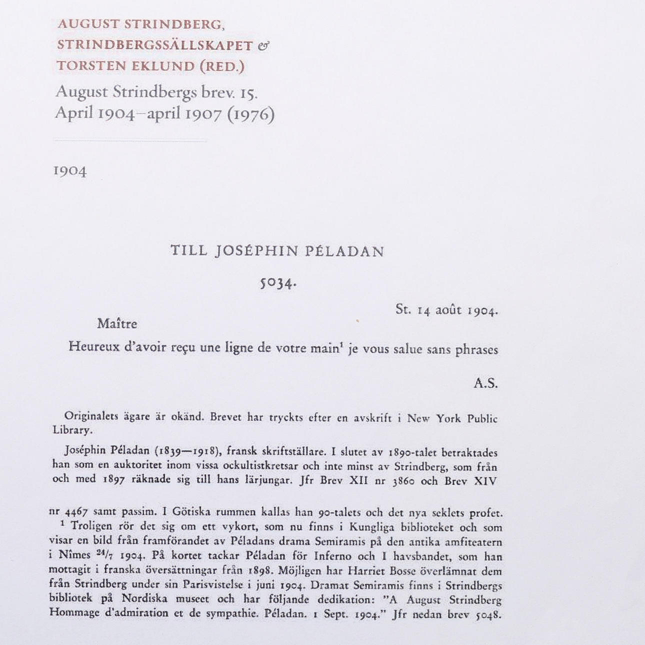 This letter was long unknown, but the recipient is the author Josephin Péladan (1839-1918), who was a French writer with a reputation as an authority within occultist circles, and not least by Strindberg, who from 1897 counted himself among his disciples.