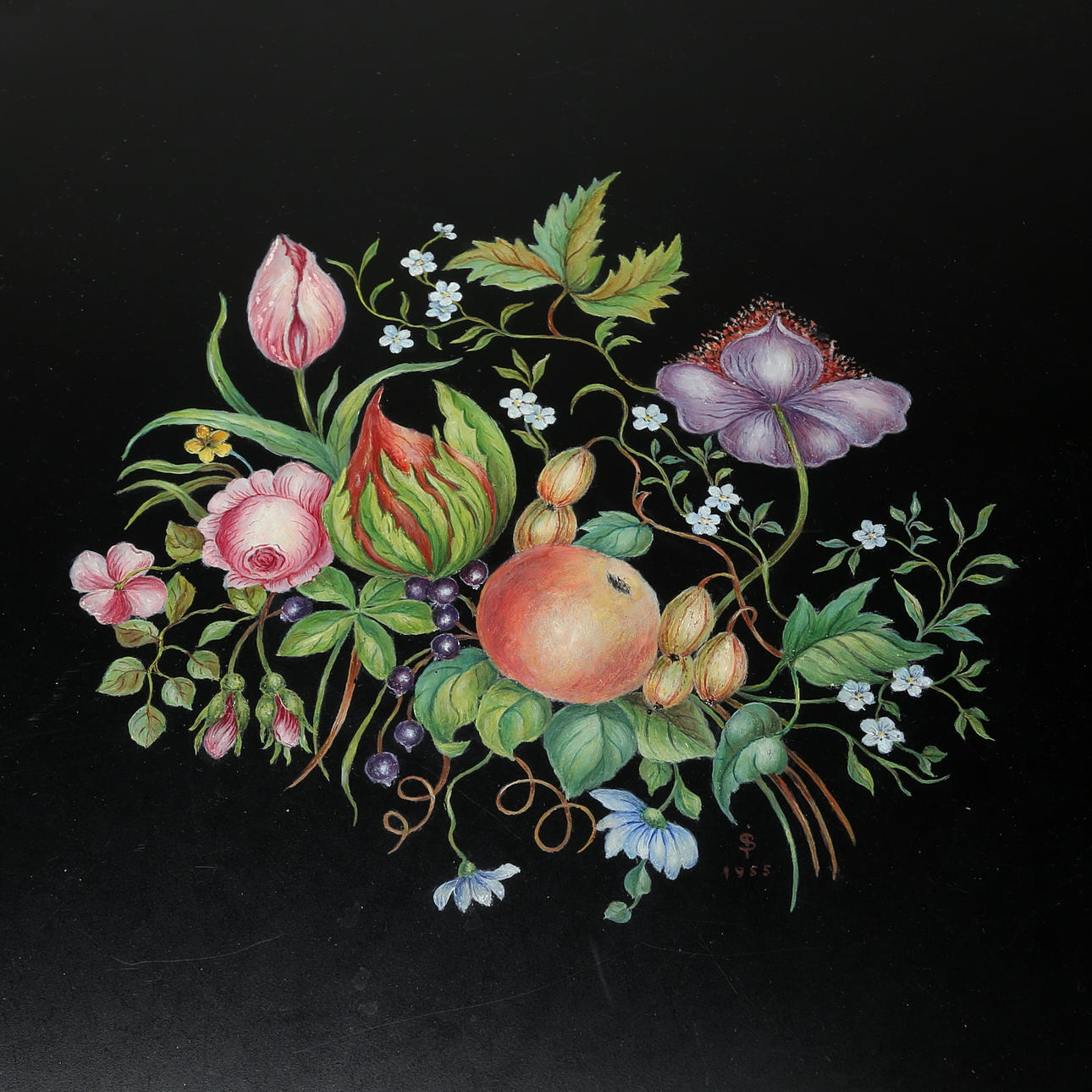 TRAY, metal, hand-painted, monogram signed 1955.