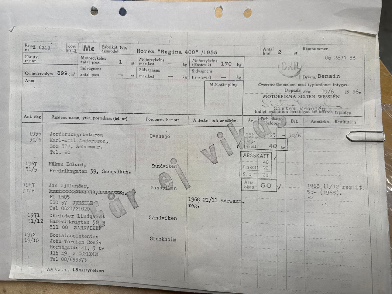 Registration number: unregistered, copy of older registration papers included, previously registered as X6219, older license plate mounted on the front fender.