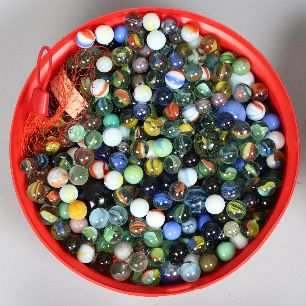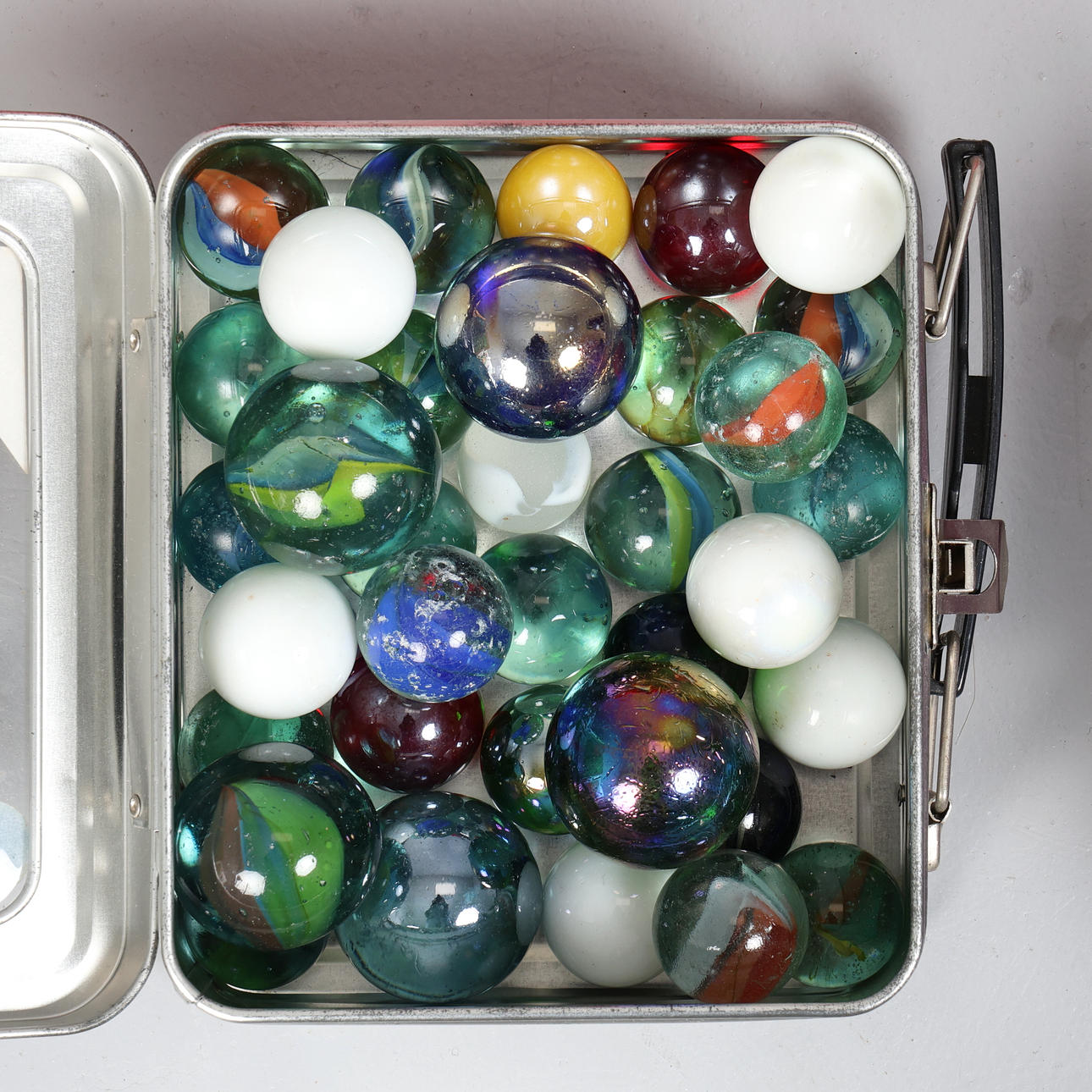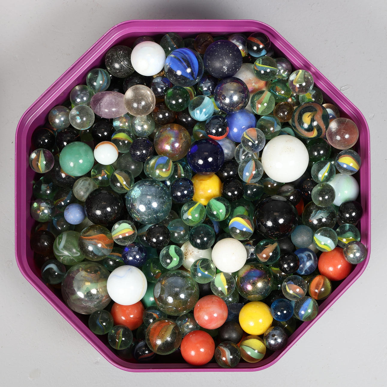 Of various styles, colours, shapes and sizes, housed in 4 tubs and tins, H.9cm x Dia.23.5cm approx. the largest.