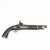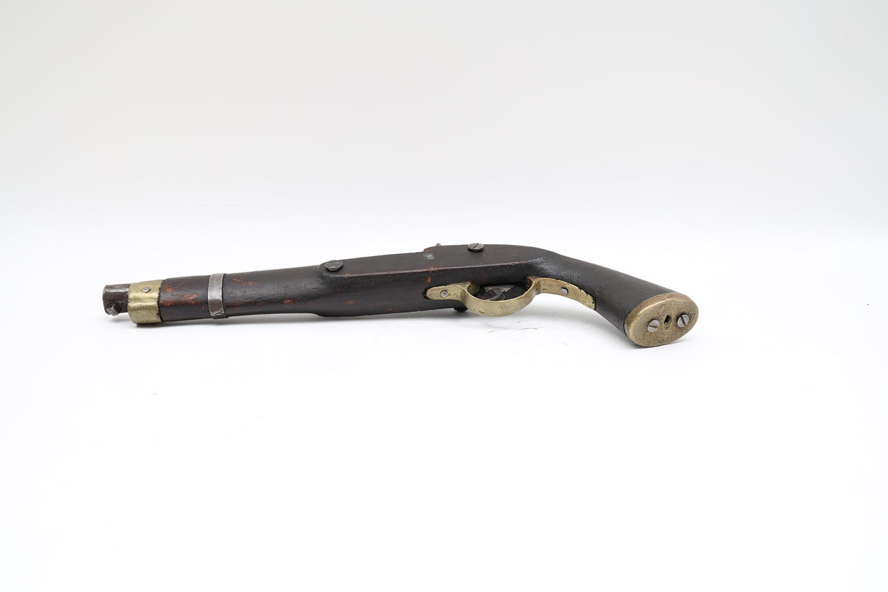 Stained wooden stock, details of brass and steel. Partially engraved decoration. Functional mechanism.