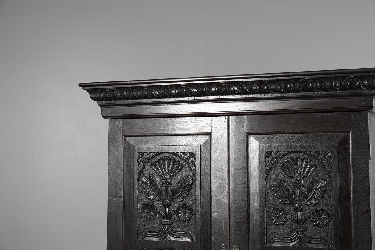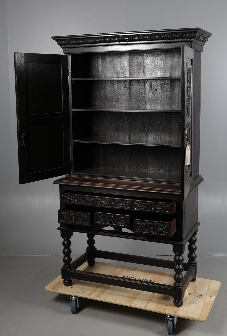 The floral carved panel cupboard doors opening to reveal three shelves, raised on a non-original base, with a long drawer and three short drawers, raised on turned supports united by stretchers, 183cm height, 100cm width, 49cm depth.