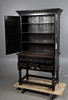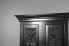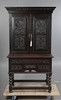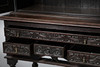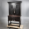 Base and cupboard were not originally together and carvings do not match, drawers with four replaced handles, some wear, marks and scuffs.