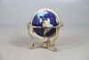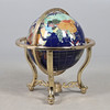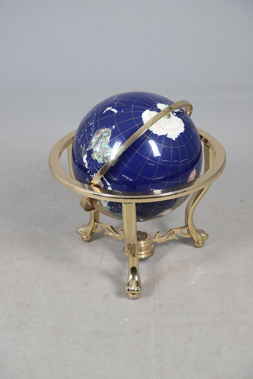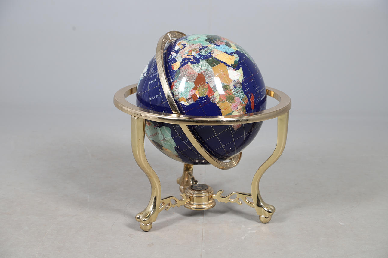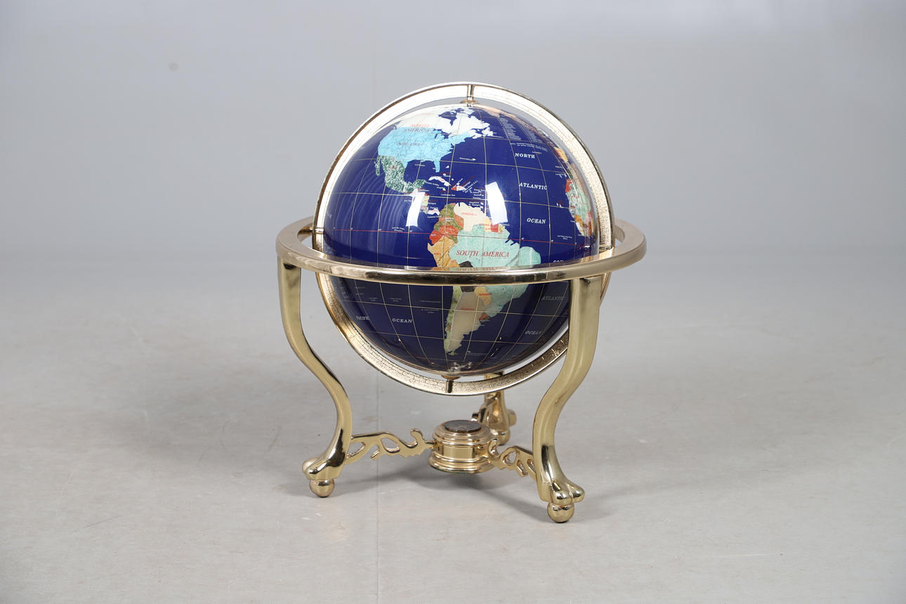 An inlaid gem set globe, with a brass base with inset compass. Approx 52cms high.