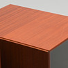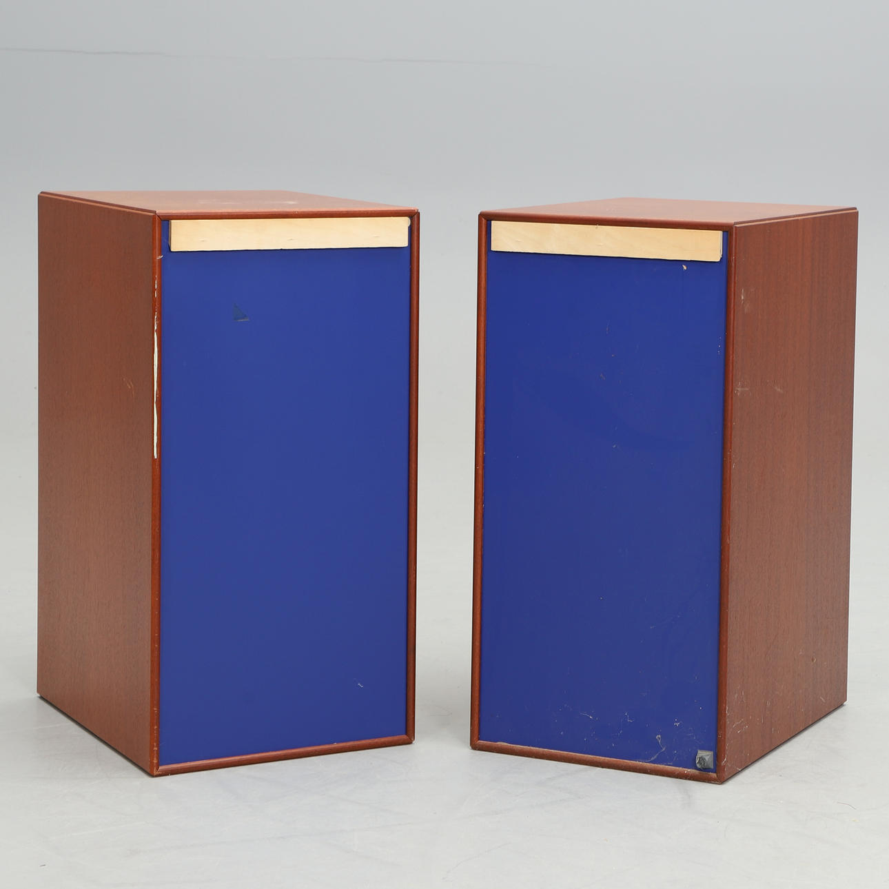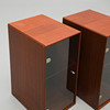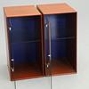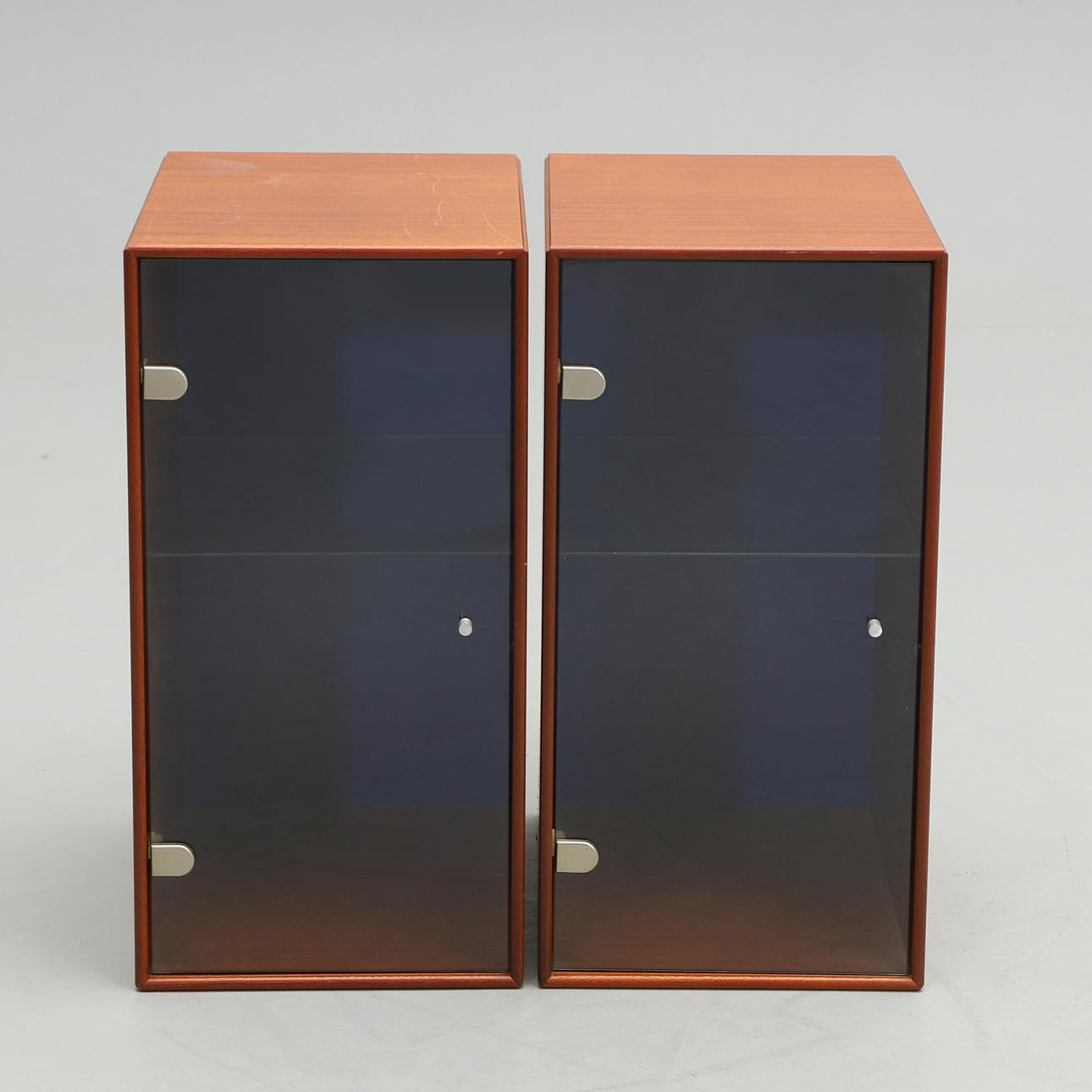 Cabinets in mahogany with blue back. Glass doors and one adjustable glass shelf each.