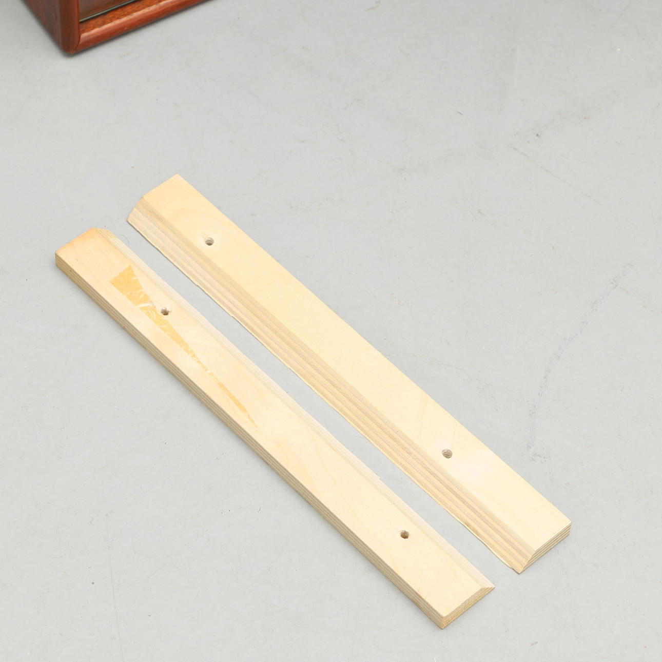 Wear from use. Marks and scratches. Wooden rails for wall mounting included.