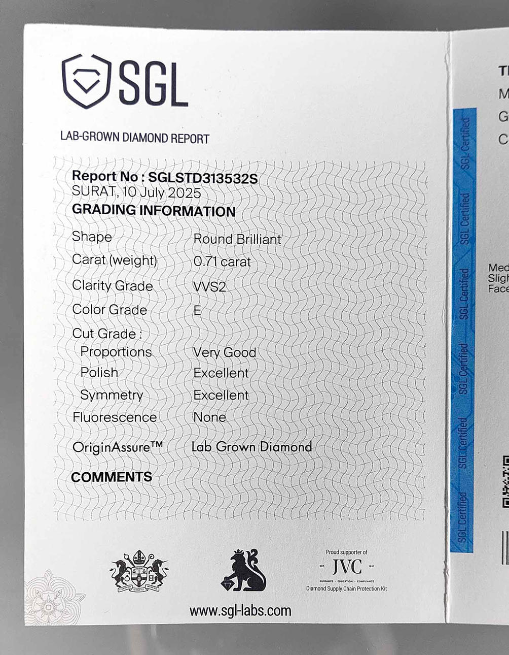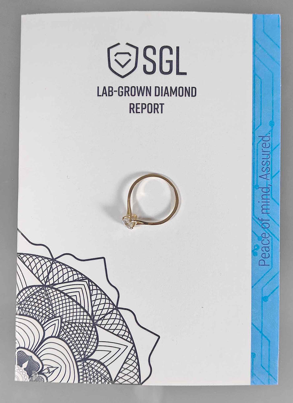 hallmarked yellow gold 585 (14 carat) and 0.71, approx. 1.15 grams, solitaire lab-grown diamond of 0.71 ct. river (E), VVS2, ring size 53, with certificate.