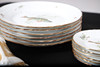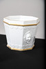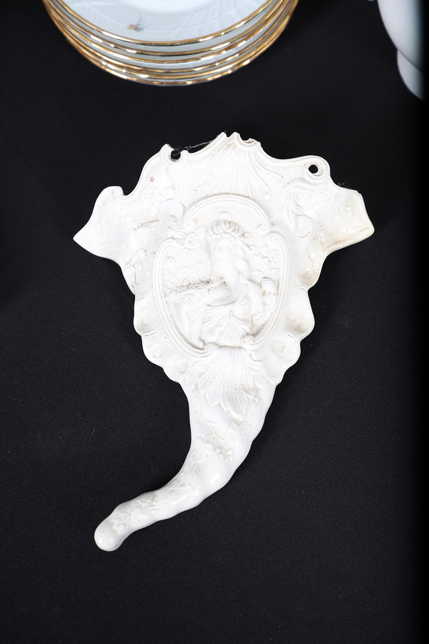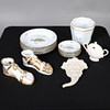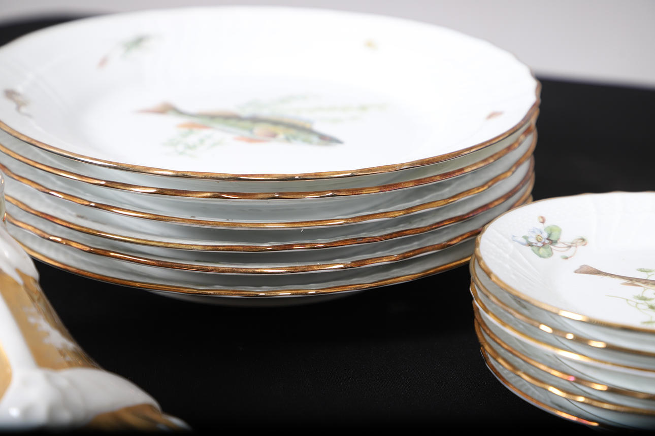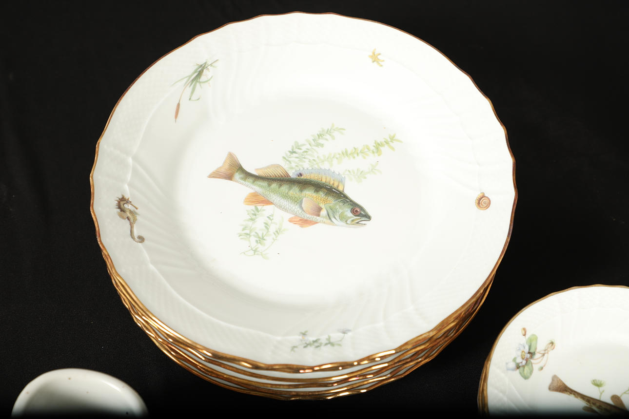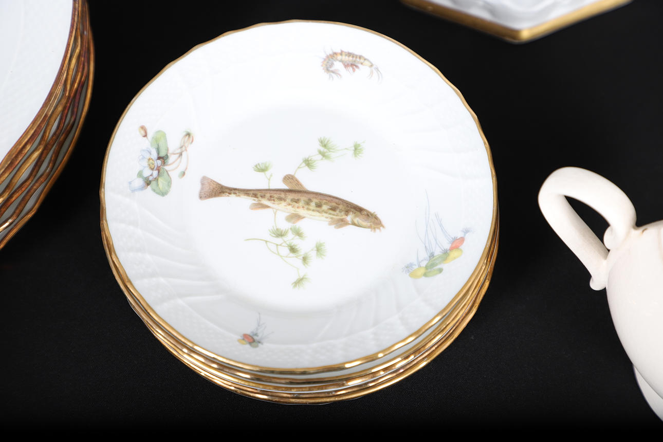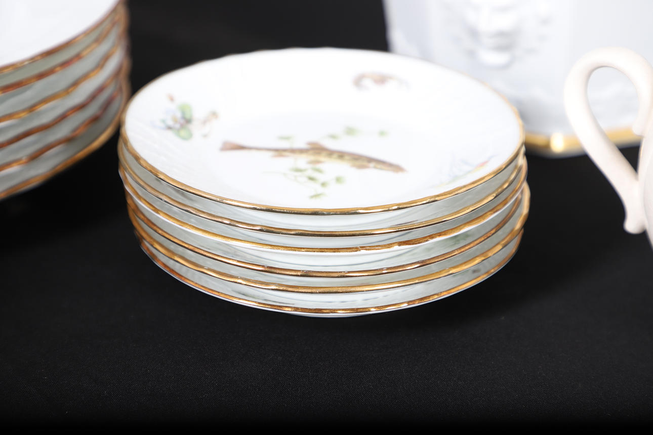 deorated with freshwater fish, comprising of six dinner plates, 25cm diameter and six small plates, 15cm diameter; together with a pair of Fornasetti-Milano ceramic sandled feet, 20cm long, an octogaonal planter, a two handled preserve pot and cover, and a 19th century creamware wall pocket, 23cm high.