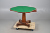 With serpentine edges, single leaf opening to walnut veneer and green felt playing surface above a games compartment with contents, raised on fluted pillar on pedestal base with bun feet, opening dimensions D94 x H70cm.