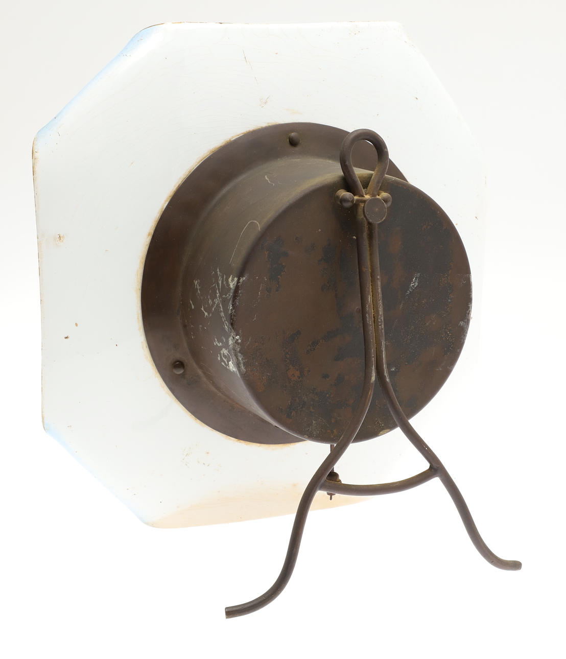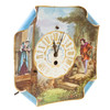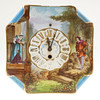 of shaped form, the front decorated in the Watteau style, with painted dial and roman numerals, on original brass easel, 26cm high.