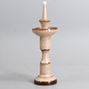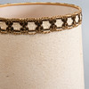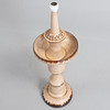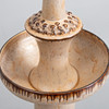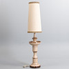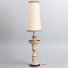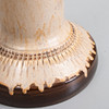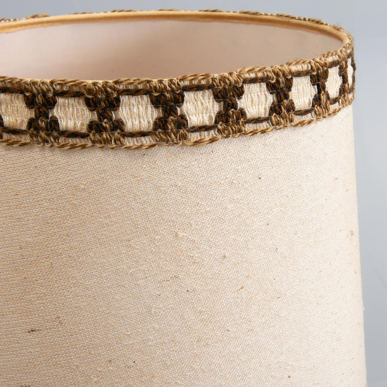 Large ceramic floor lamp in beige and brownish shades. Accompanied by a tall lampshade.