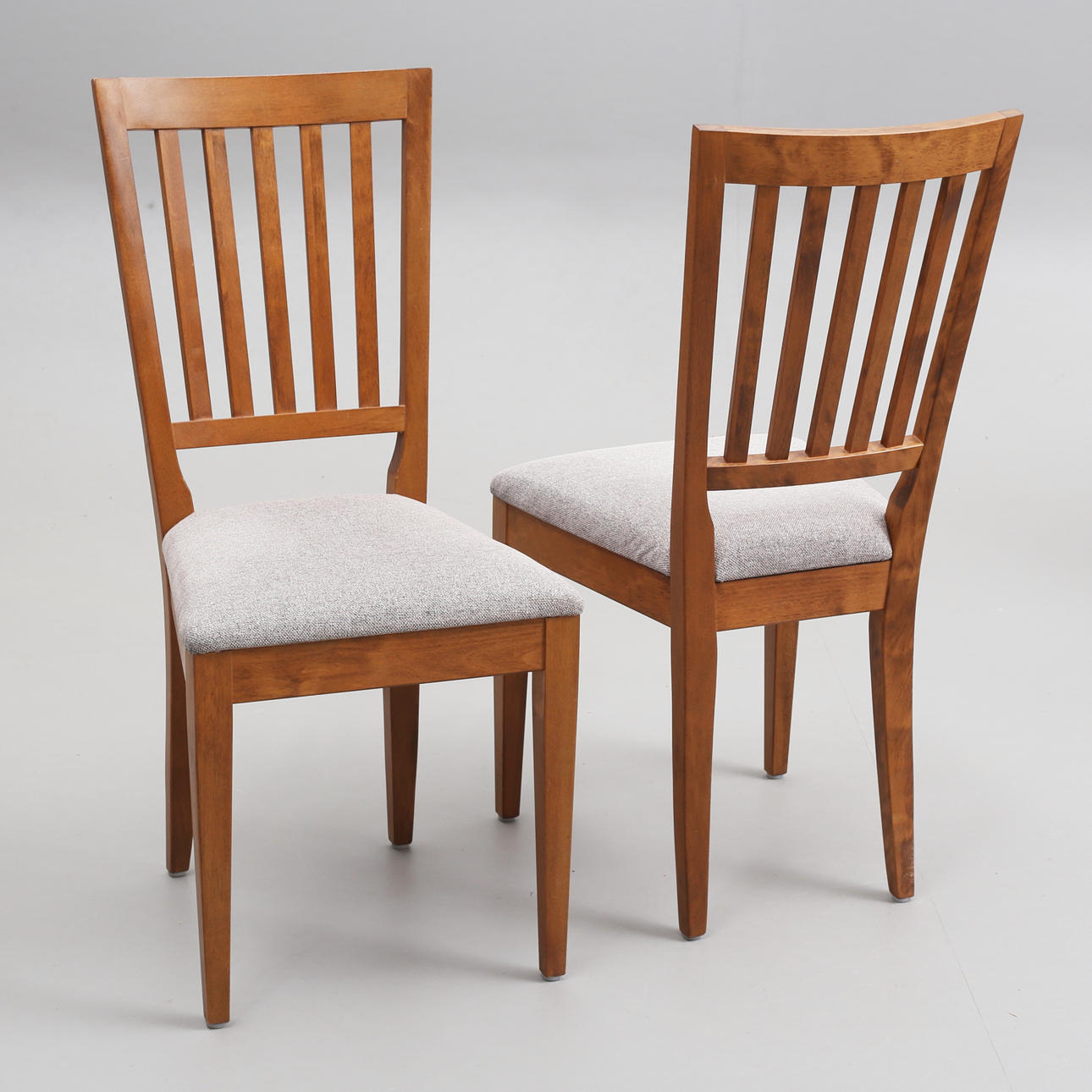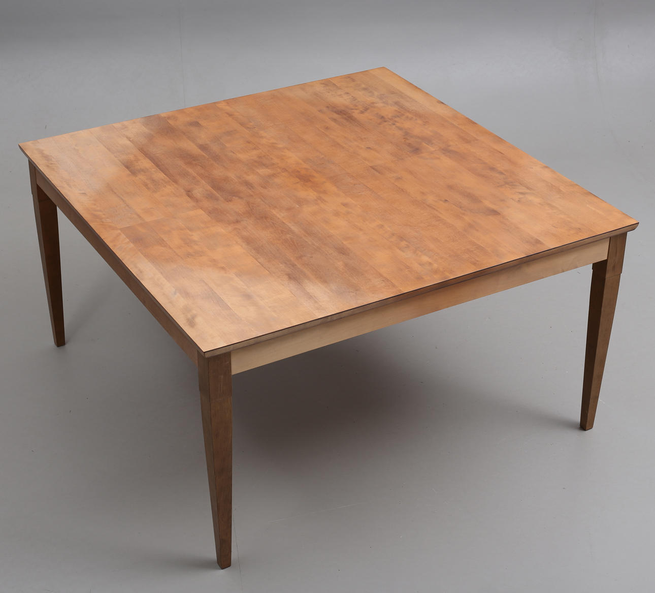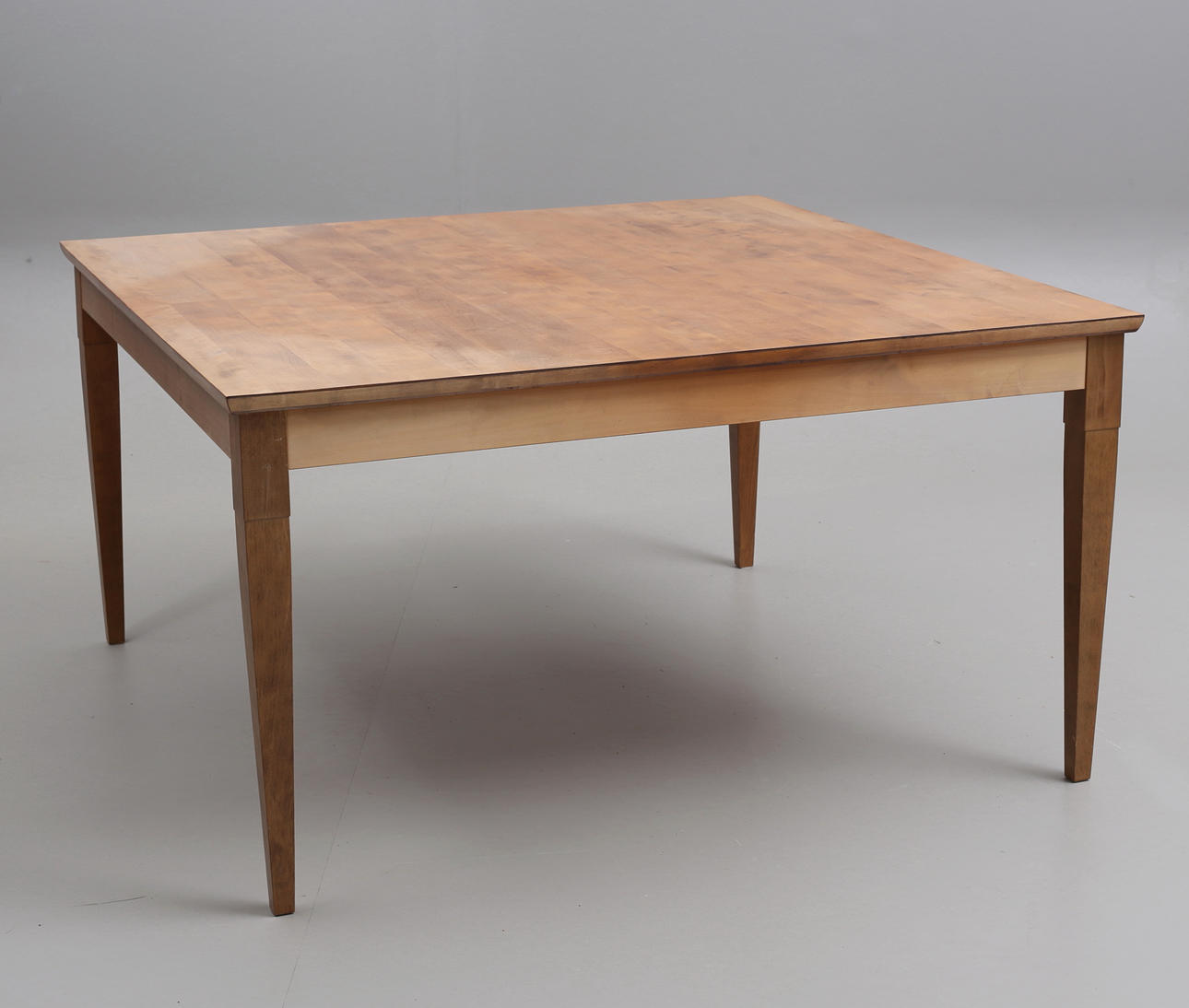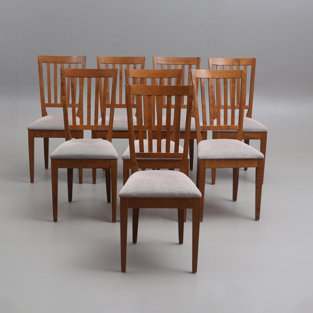 8 chairs height 96 cm, seat height 47 cm, width 44 cm Table height 76 cm, size 140 x 140 cm.
