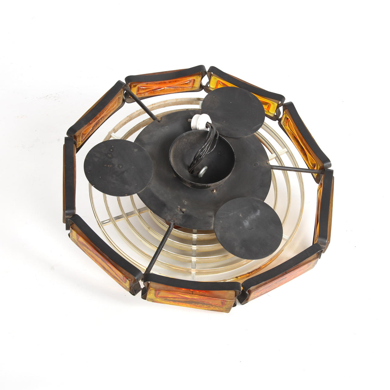 Ceiling light/flush mount. Coloured glass, iron and metal. Grid in brass-coloured metal.Småland/Sweden 1960s Diameter 42 cm.